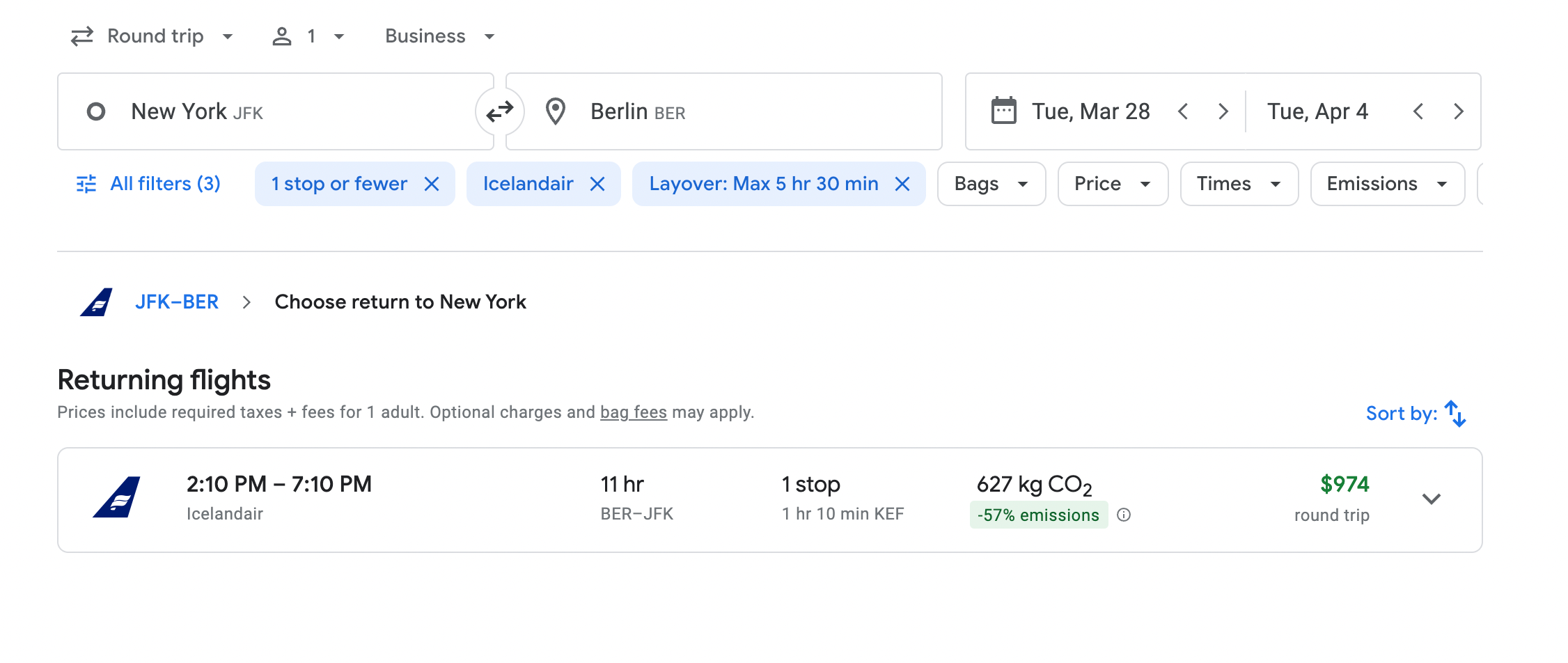 For return flights, an April 4 flight to JFK leaves Berlin at 2:10 p.m. Both flights to and from Berlin include a layover in Reykjavik.