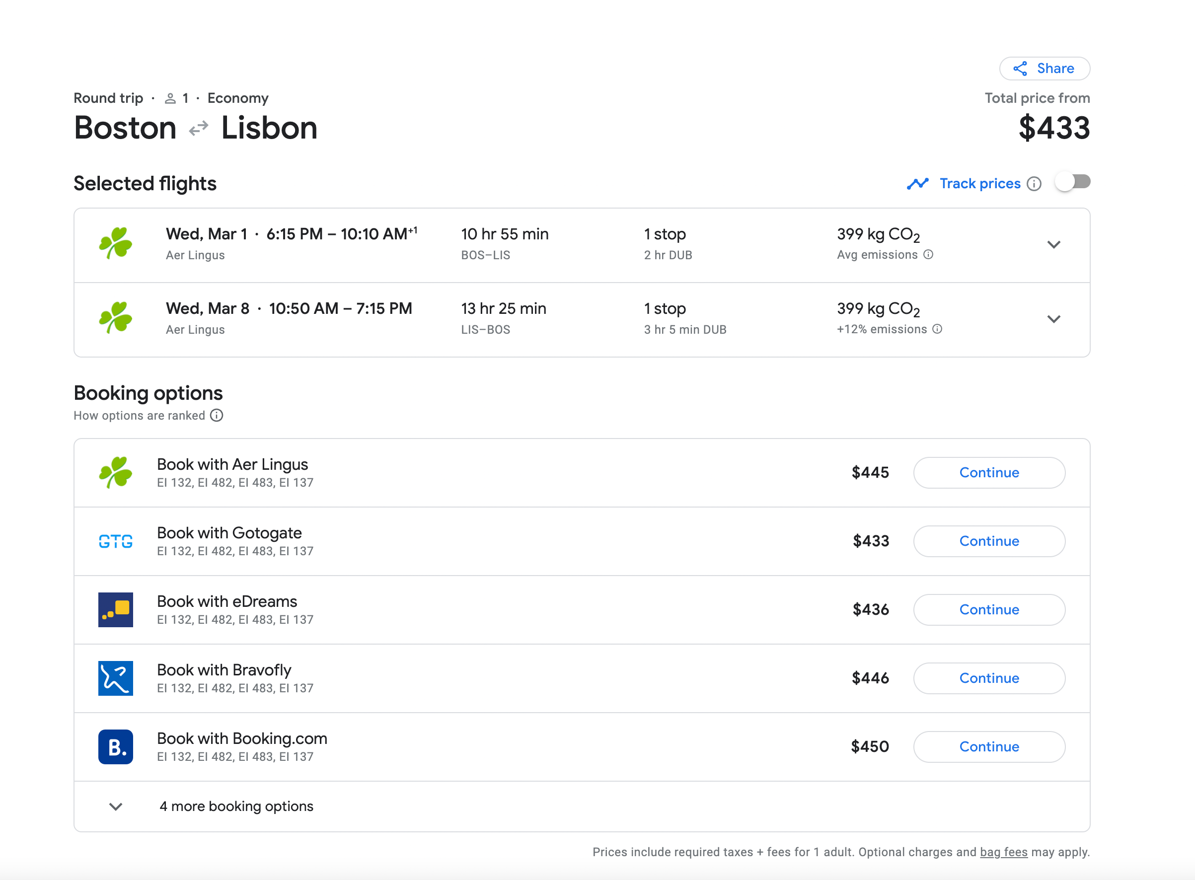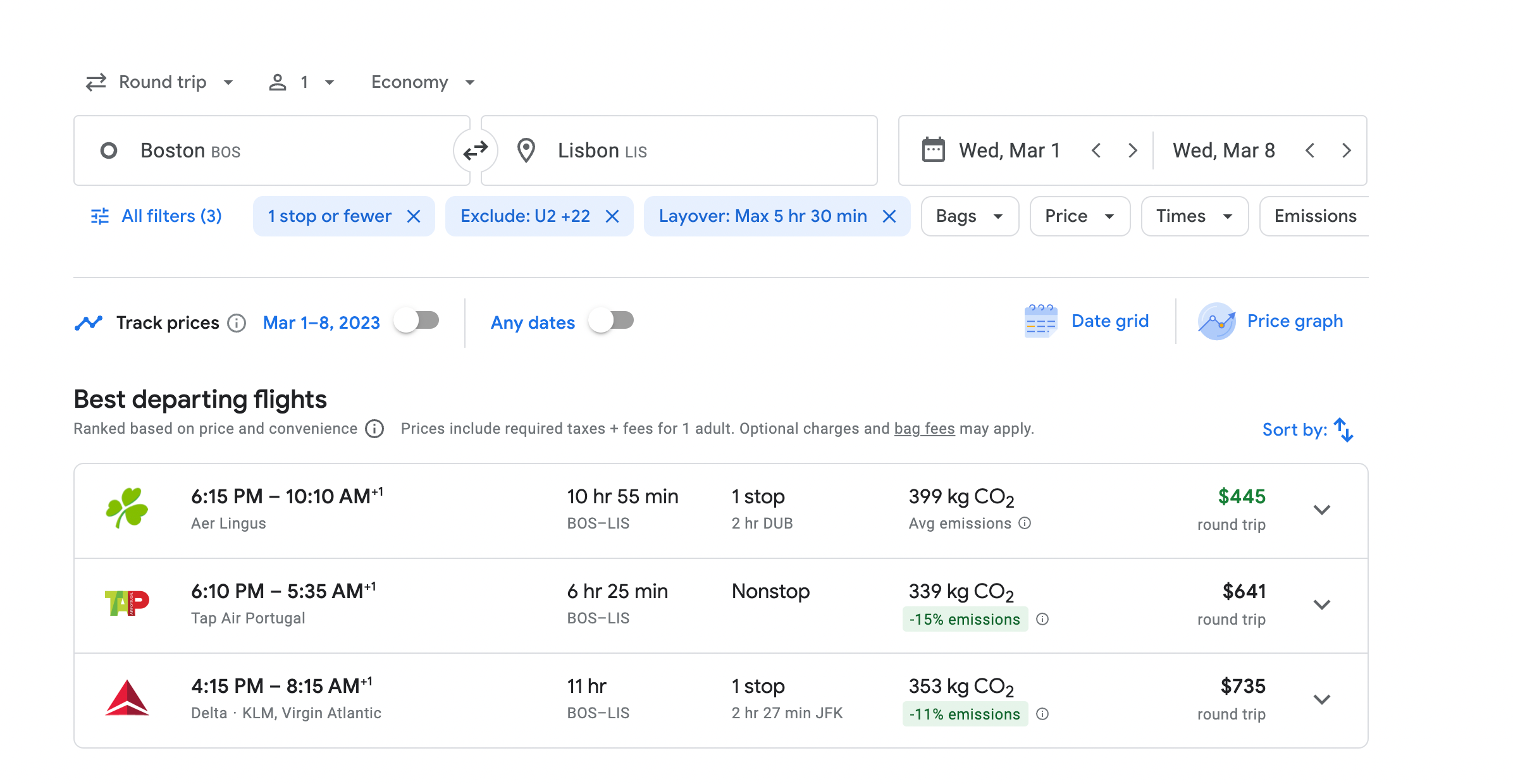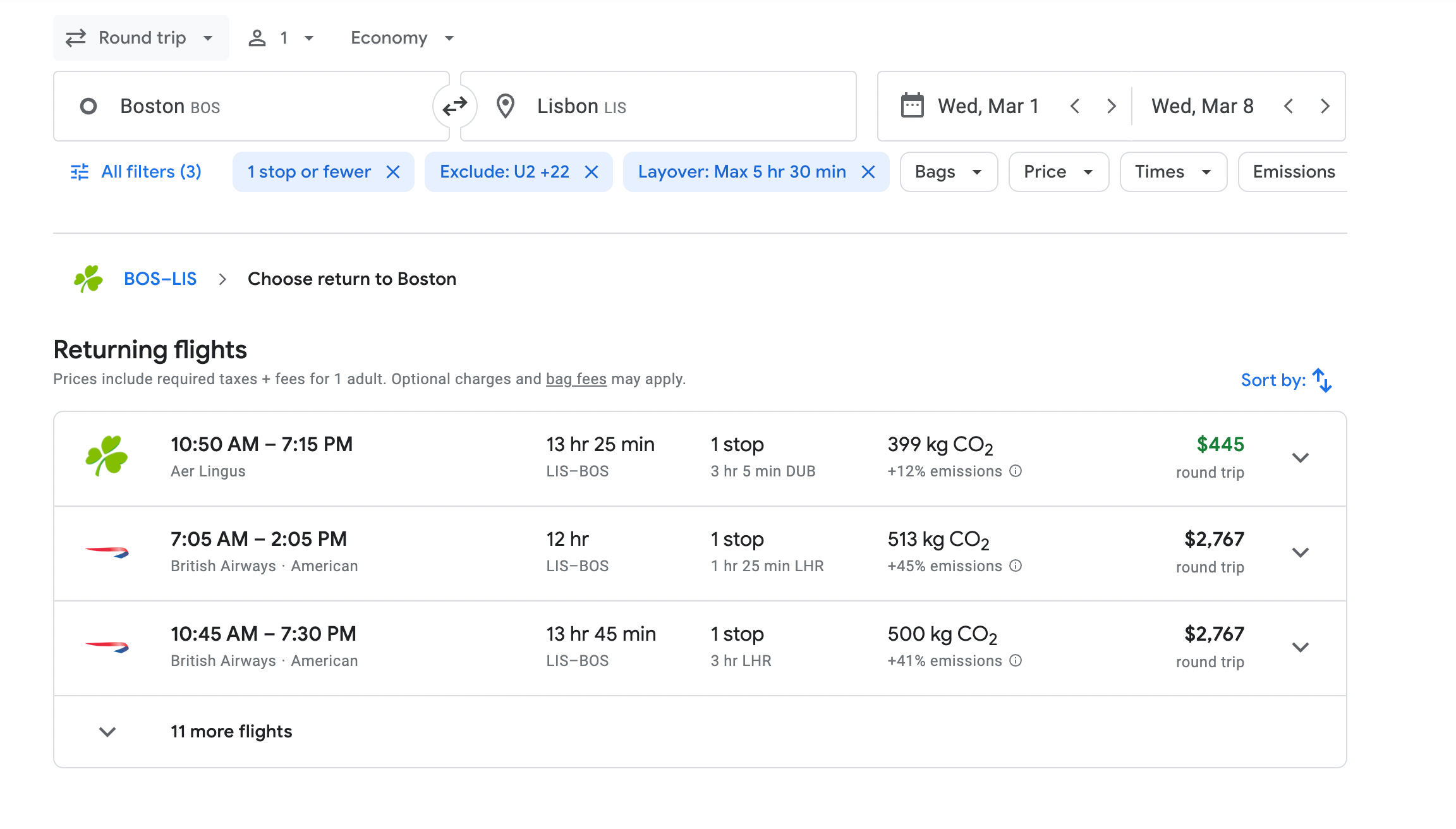 For a flight from Boston to Lisbon on March 1, Aer Lingus' 6:15 p.m. flight is the cheapest option available at $445. If you plan to return to Boston a week later, Aer Lingus offers a flight at 10:50 a.m. that keeps the fare the same. Both flights include a layover in Dublin.