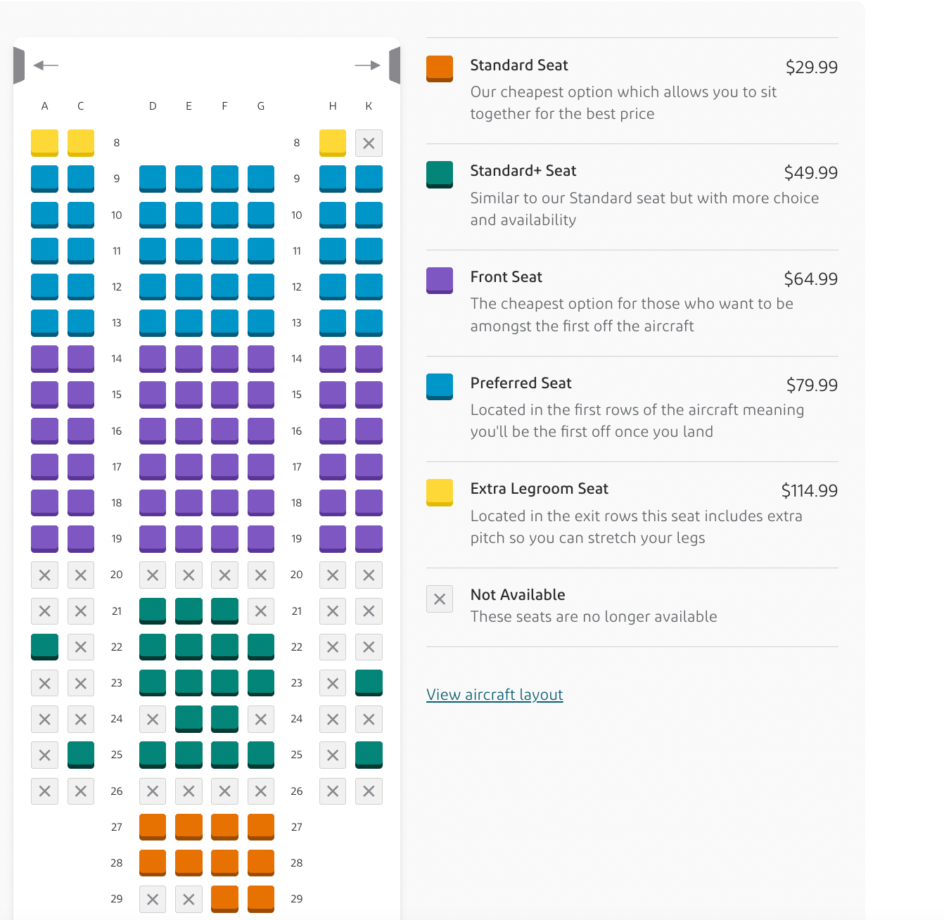 If you decide to select seats, you'll have to pay for four different seat selections on the round-trip flight. Seats from the Boston to Dublin segment cost anywhere from $29.99 to $114.99; seats from the Dublin to Lisbon segment range from $5.99 to $25.99. The most expensive seats are located near the exit rows and have extra legroom.
