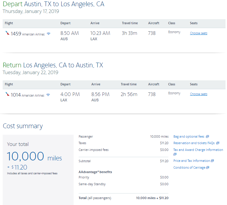 At current TPG valuations, 5,000 AAdvantage miles are worth approximately $70. Adding in taxes and fees of $5.60 each way, this is like getting a $76 one-way — or $151 round-trip — deal. Even better, there's no basic economy restrictions on these tickets. That means American Airlines Executive Platinum elites can also score free upgrades on these award tickets.