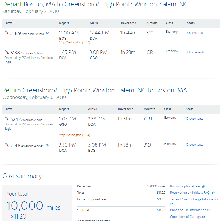 Boston (BOS) to Greensboro (GSO) for 10,000 miles + $11 round-trip: