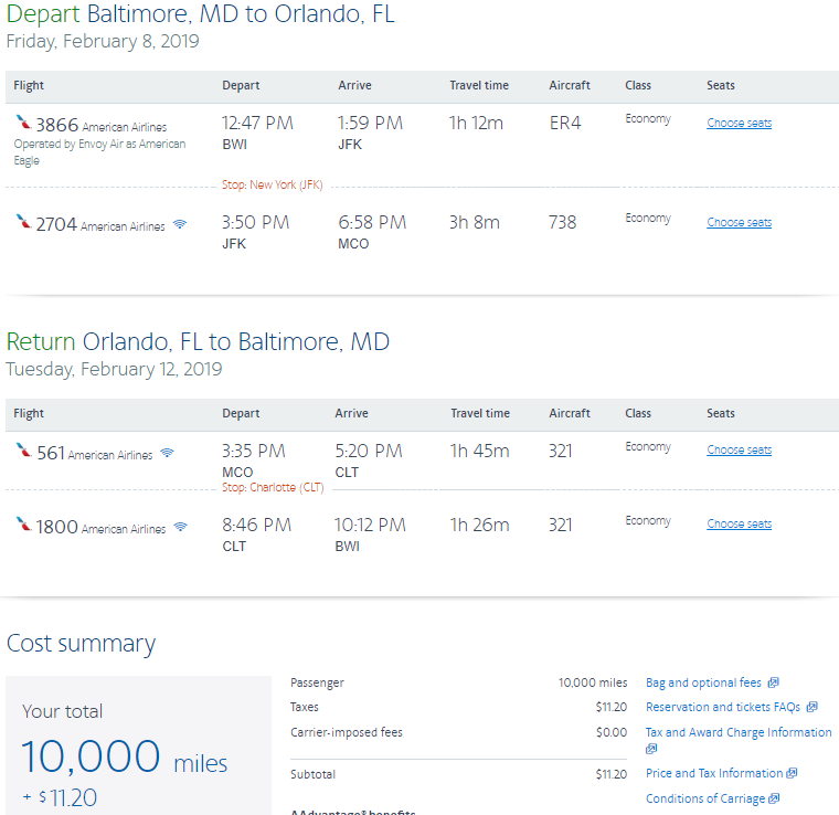 Baltimore (BWI) to Orlando (MCO) for 10,000 miles + $11 round-trip: