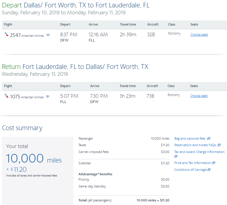 Dallas/Fort Worth (DFW) to Fort Lauderdale (FLL) for 10,000 miles + $11 round-trip nonstop: