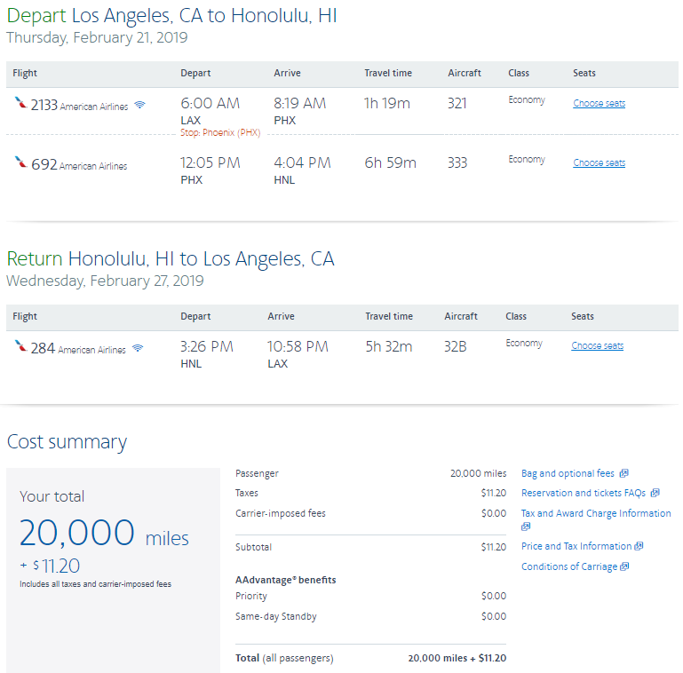 Los Angeles (LAX) to Honolulu (HNL) for 20,000 miles + $11 round-trip: