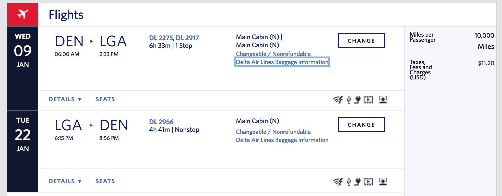 Denver (DEN) to New York (LGA) for 10,000 SkyMiles + $11 round-trip: