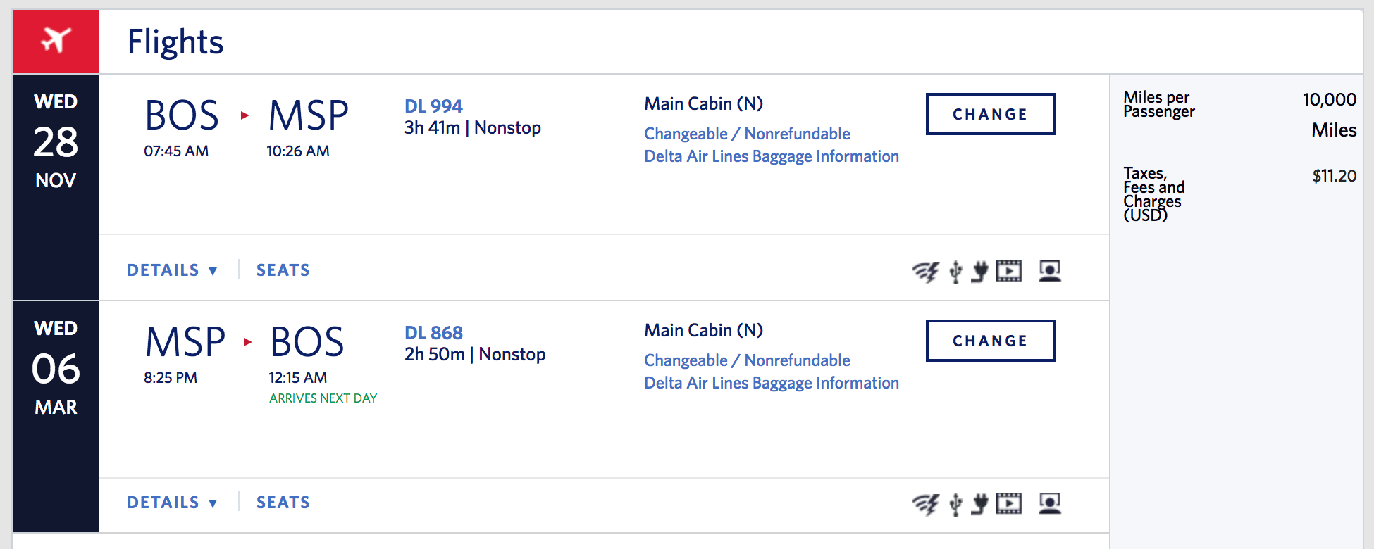 Boston (BOS) to Minneapolis/St. Paul (MSP) for 10,000 SkyMiles + $11 round-trip: