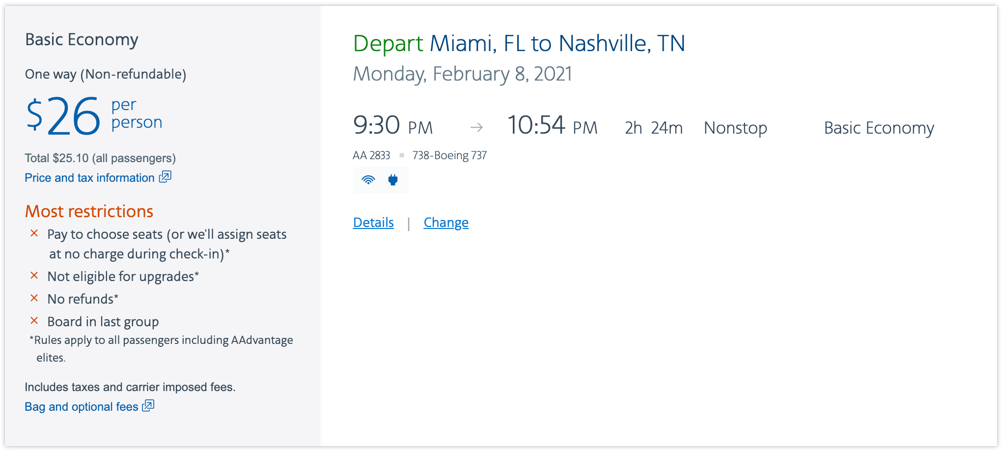 Miami (MIA) to Nashville (BNA) for $25 one-way nonstop in basic economy on American Airlines: