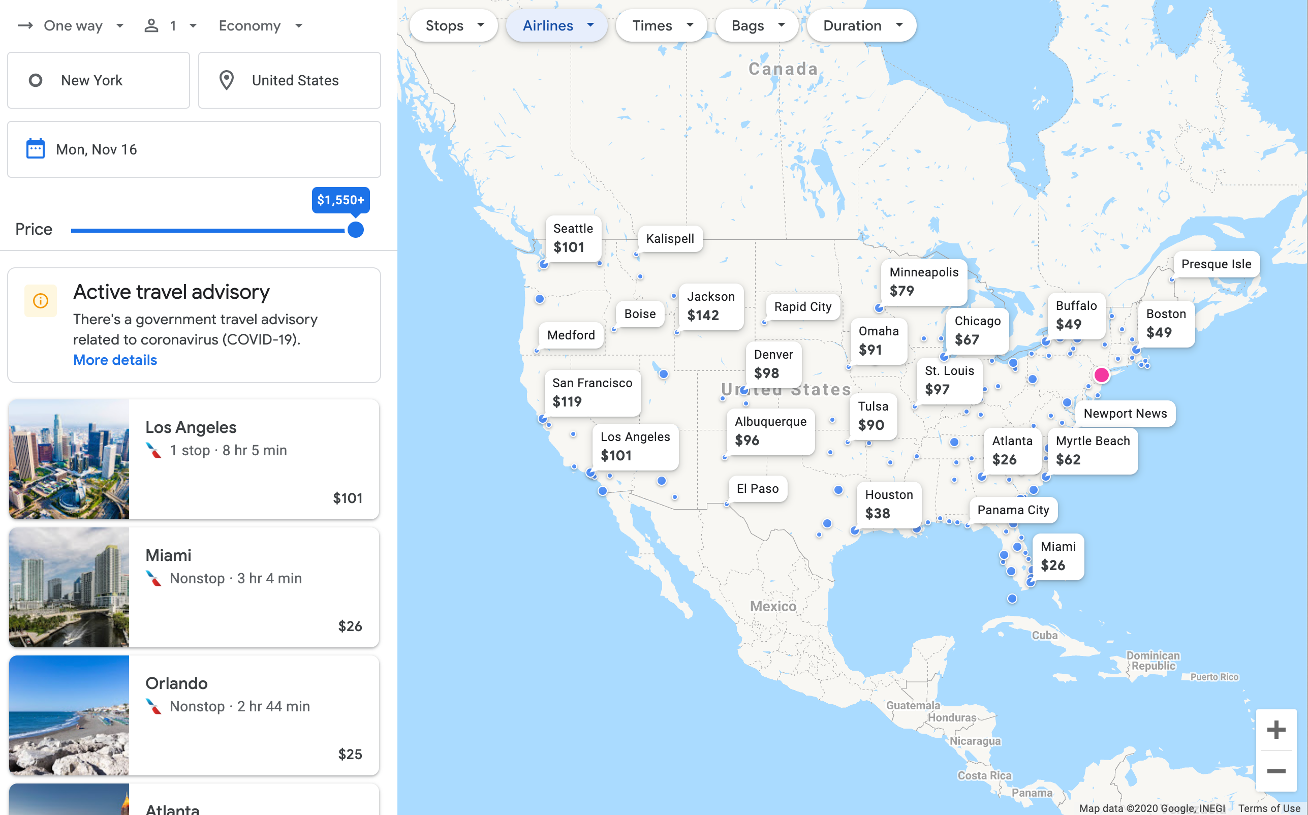 If you don't have a specific destination in mind, select economy class and type "United States" in the "Where to?" field for a map showing the cheapest flights to destinations around the continent for your desired dates.