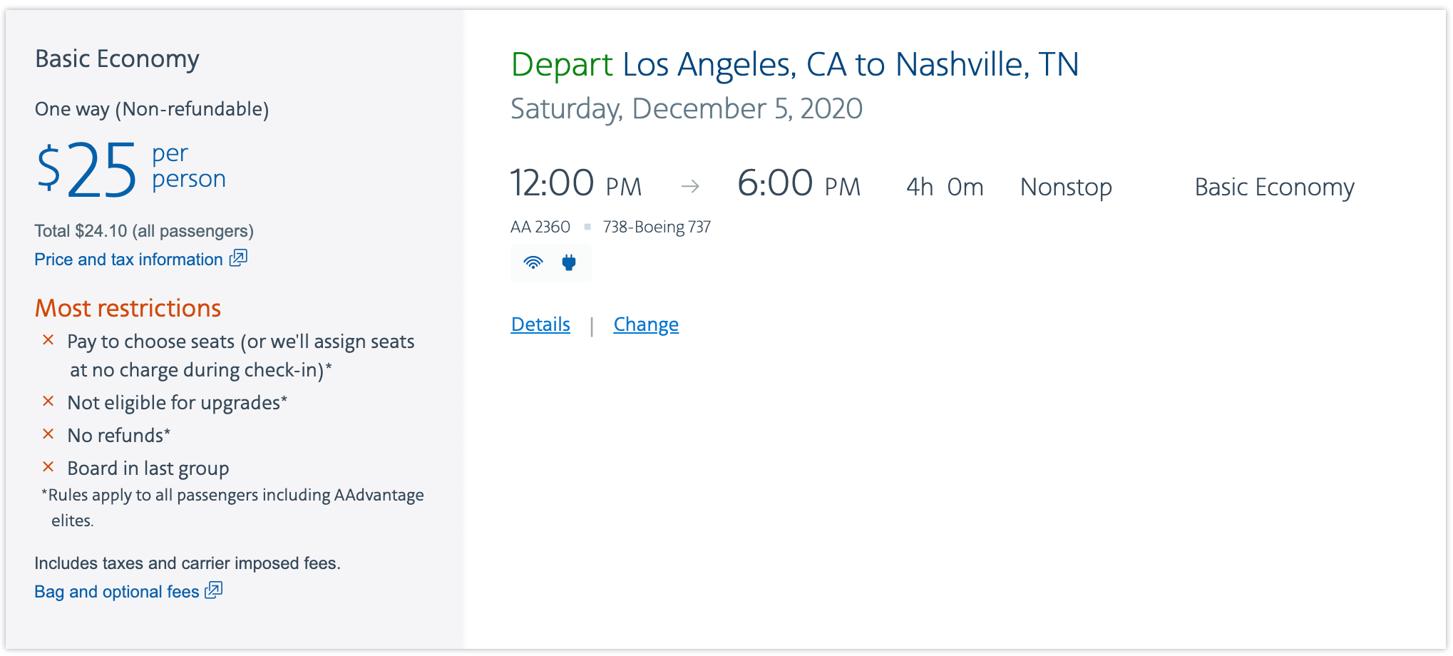 Los Angeles (LAX) to Nashville (BNA) for $24 one-way nonstop in basic economy on American Airlines: