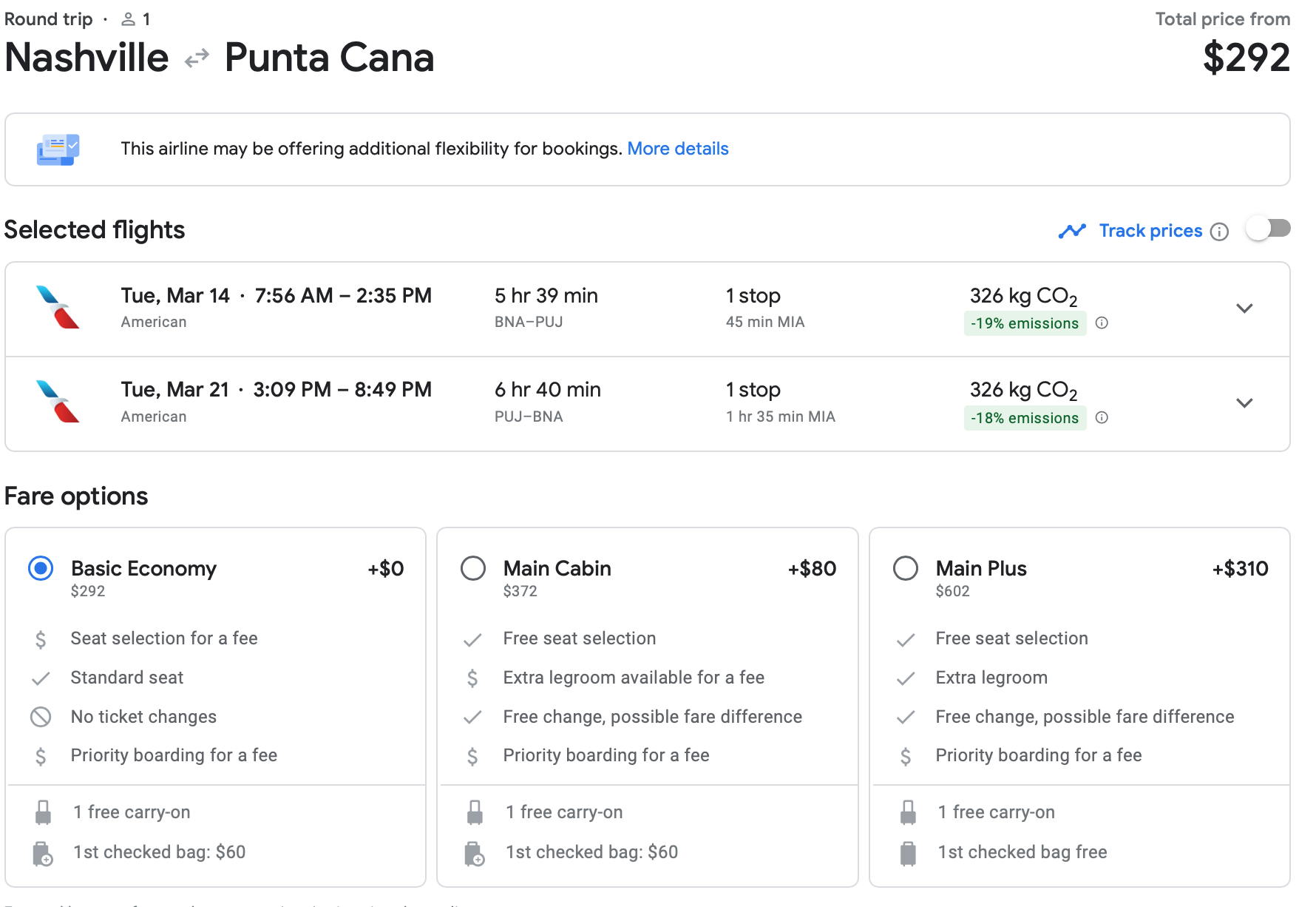 You can book a trip to Punta Cana from Nashville (BNA) in mid-March 2023 on American for only $292 round-trip. You have a quick layover in Miami, but that price is dirt cheap. And it comes with a free carry-on bag, too.
