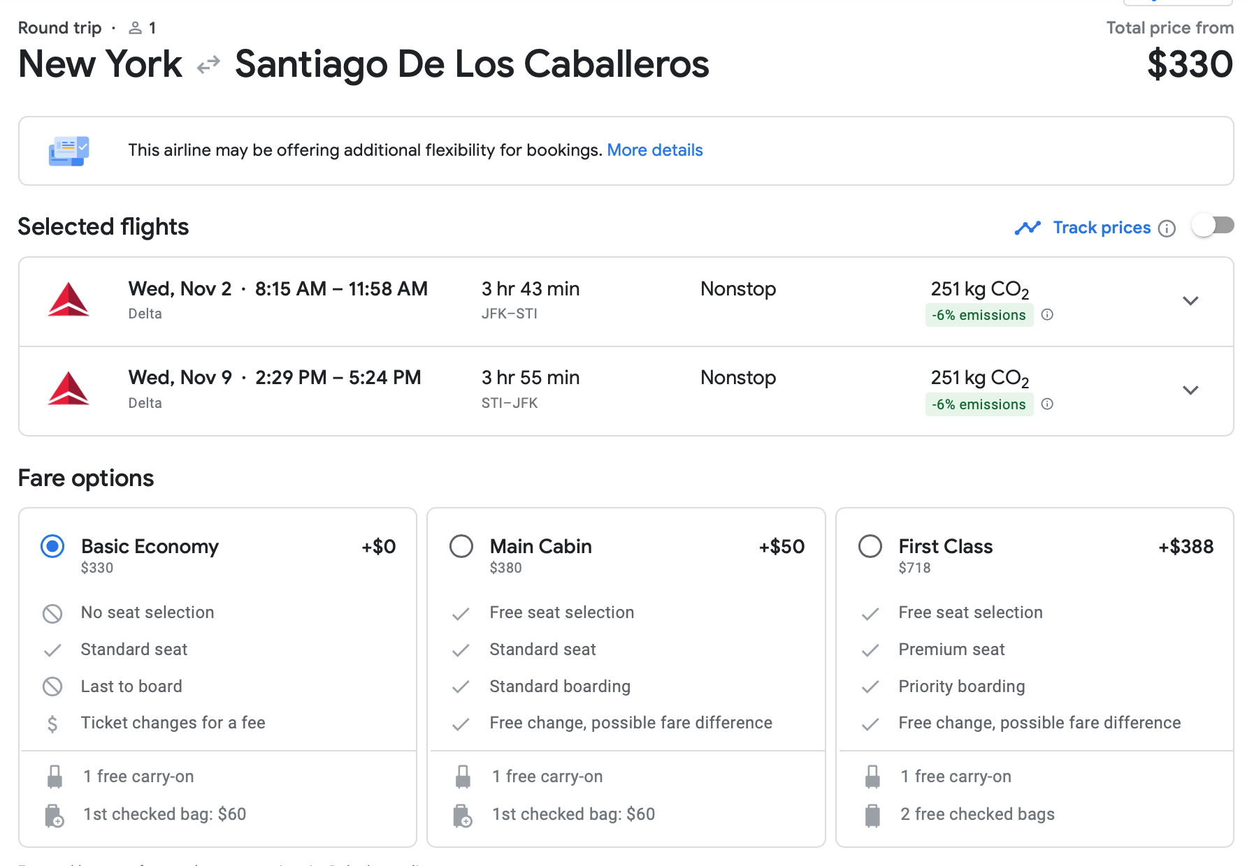NYC to Santiago (STI) nonstop on Delta for an early November vacation can be booked for $330 round-trip. This fare comes with a free carry-on.