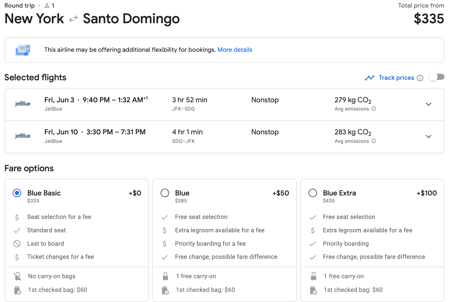 If Newark Liberty Airport (EWR) is a more convenient departure point for you, you can find nonstop flights to Punta Cana at the same $308 price. Again, it's JetBlue's most restrictive fare, so keep that in mind with regards to your luggage.
