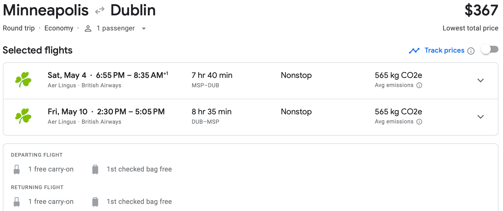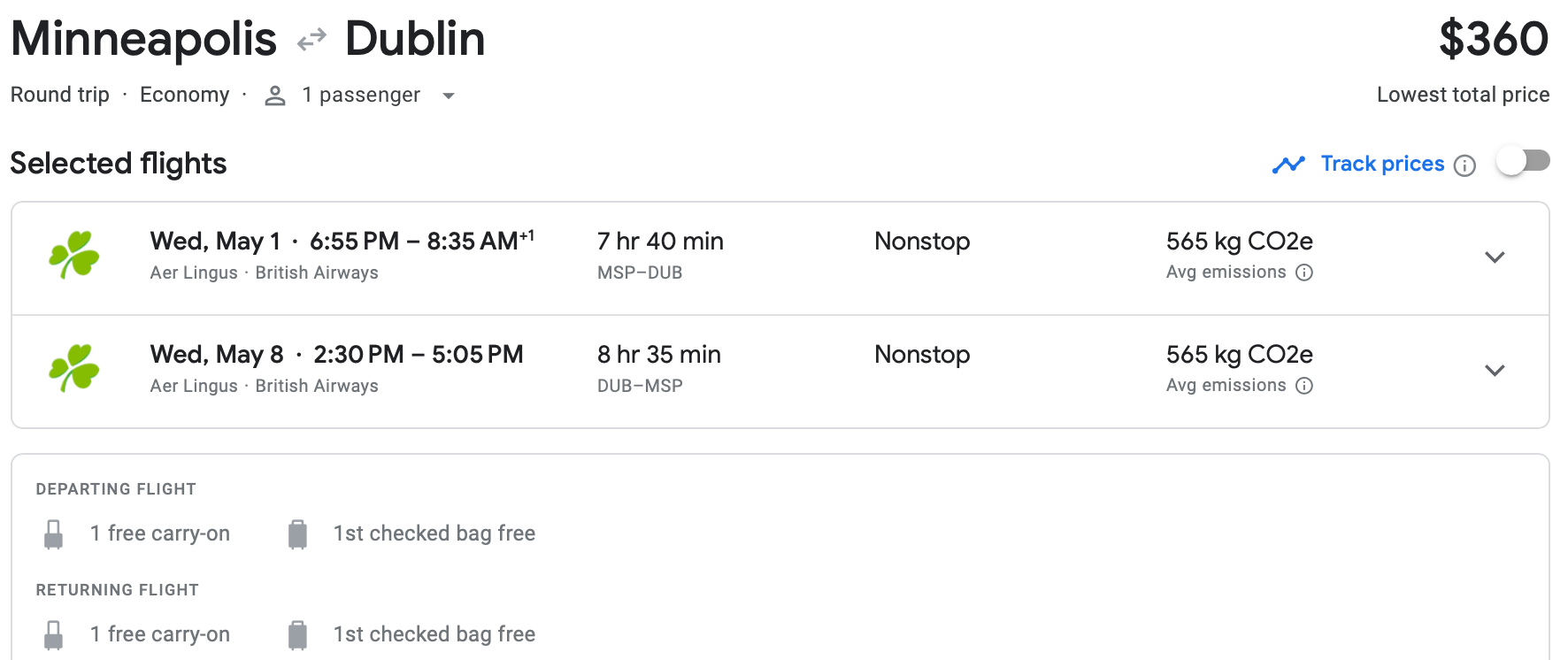 As mentioned above, the Minneapolis fares aren't as easy to find in this deal. Still, we found this gem in early May: a nonstop itinerary from Minneapolis-St. Paul International Airport (MSP) to Dublin Airport (DUB) for only $360 round-trip. This ticket gets you a carry-on and the first checked bag for free.