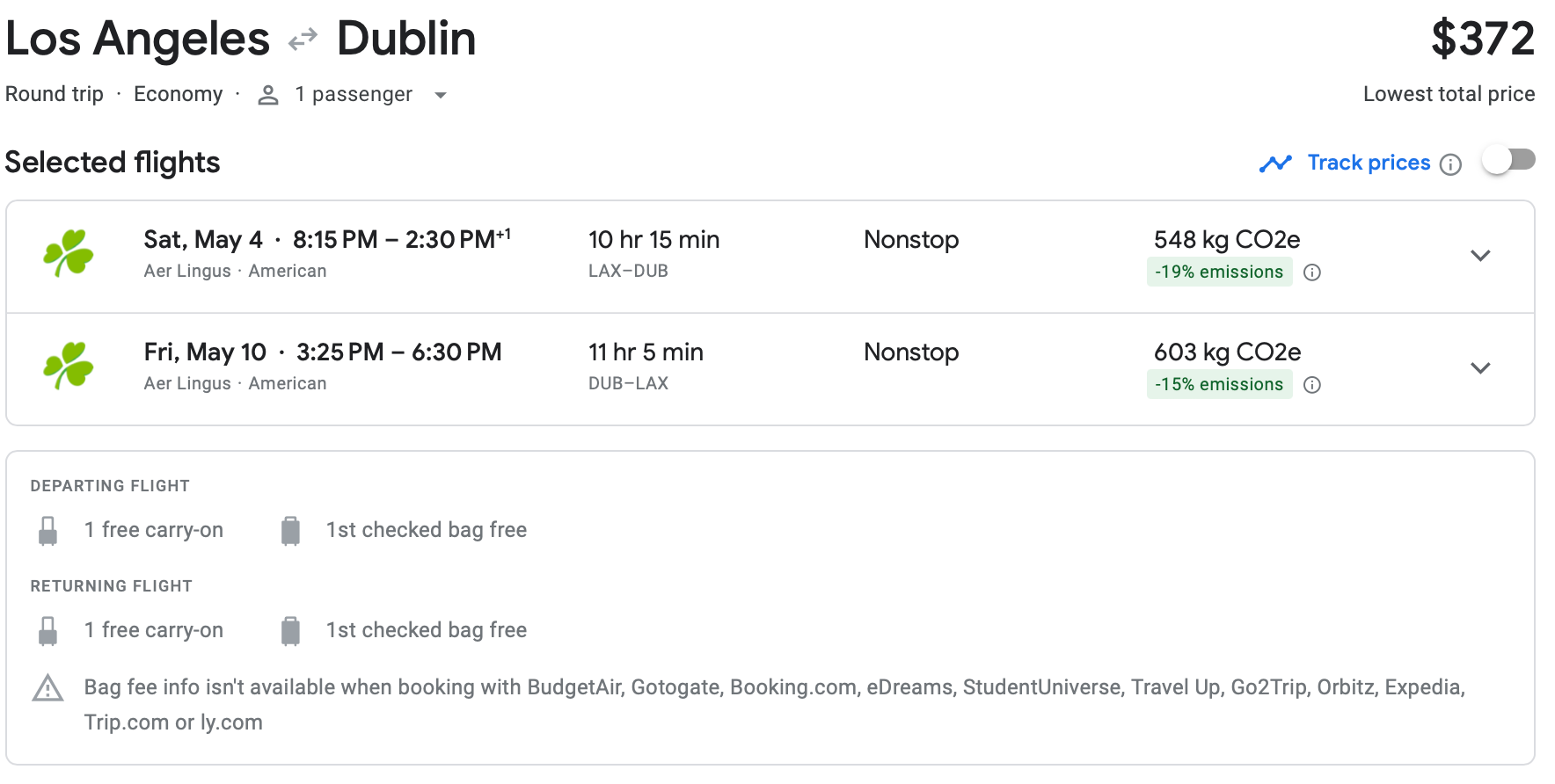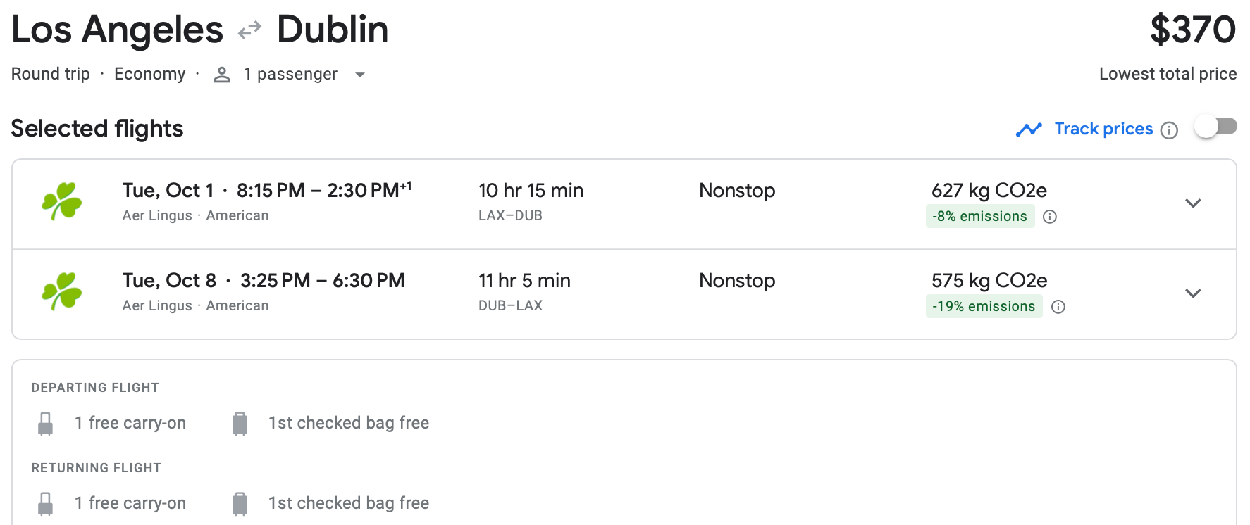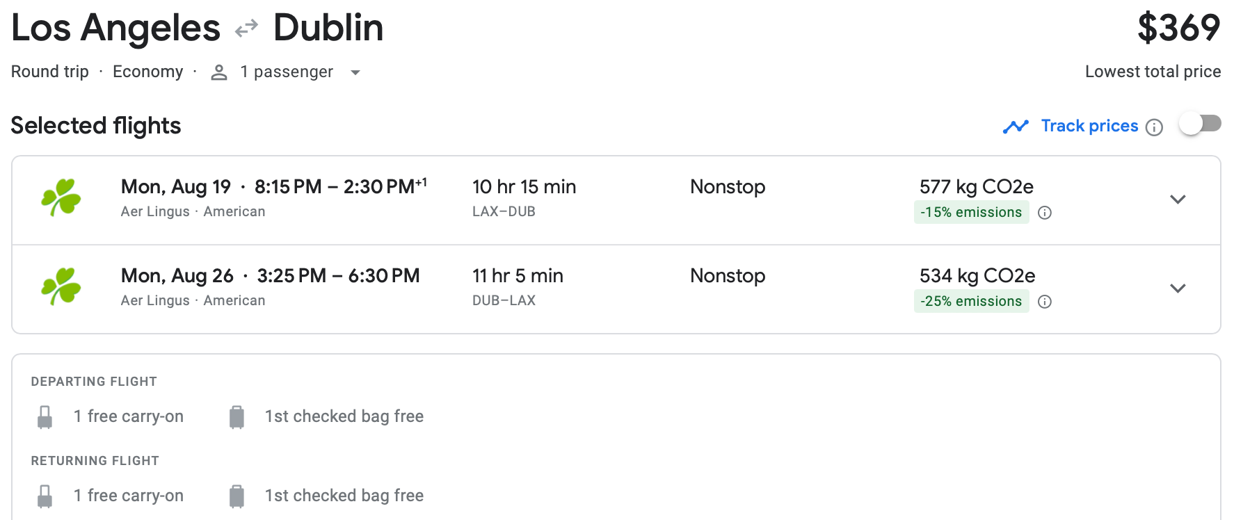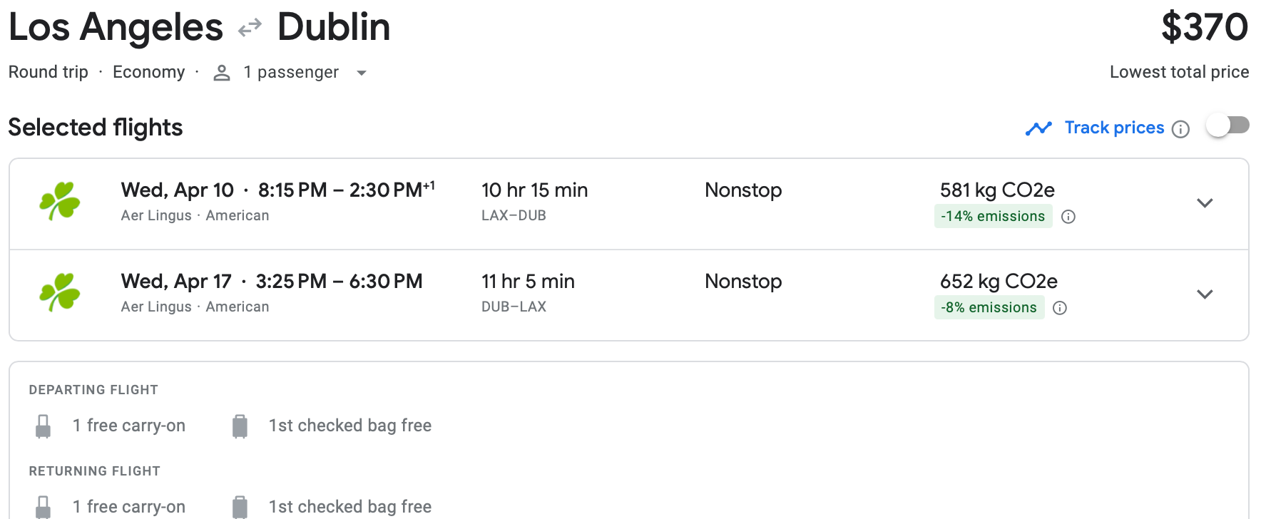 The prices in this sale are for economy fares. Aer Lingus' economy-tier tickets come with a free carry-on bag. Checking luggage normally will cost you around $55 each way, except in this sale, you get the free carry-on and your first checked bag for free.