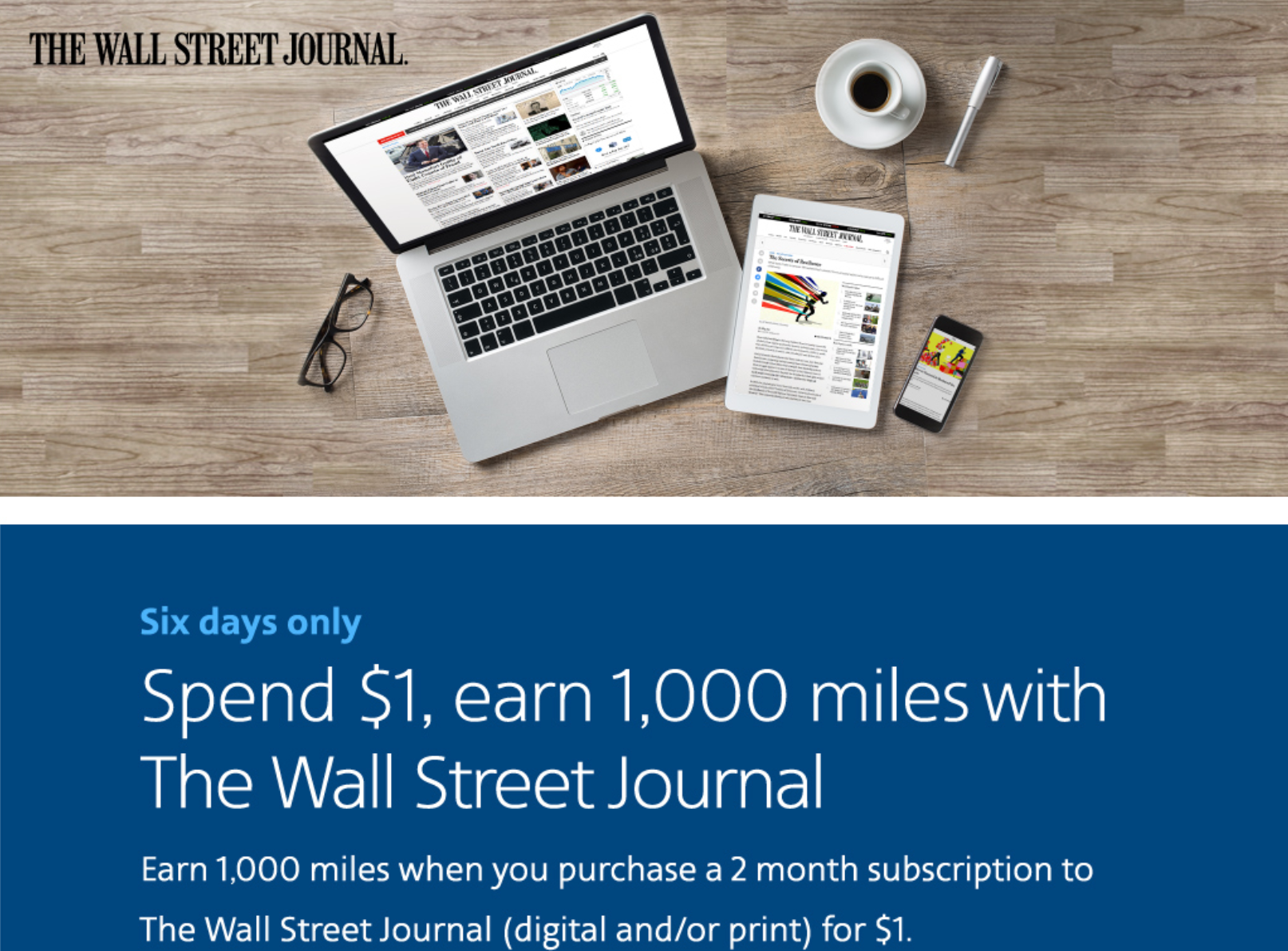 The American Airlines shopping portal launched the a limited-time promotion, where you'll net 1,000 miles and a two-month subscription to the Wall Street Journal for just $1. The deal ends Monday, Oct. 15 at 11:59pm ET.