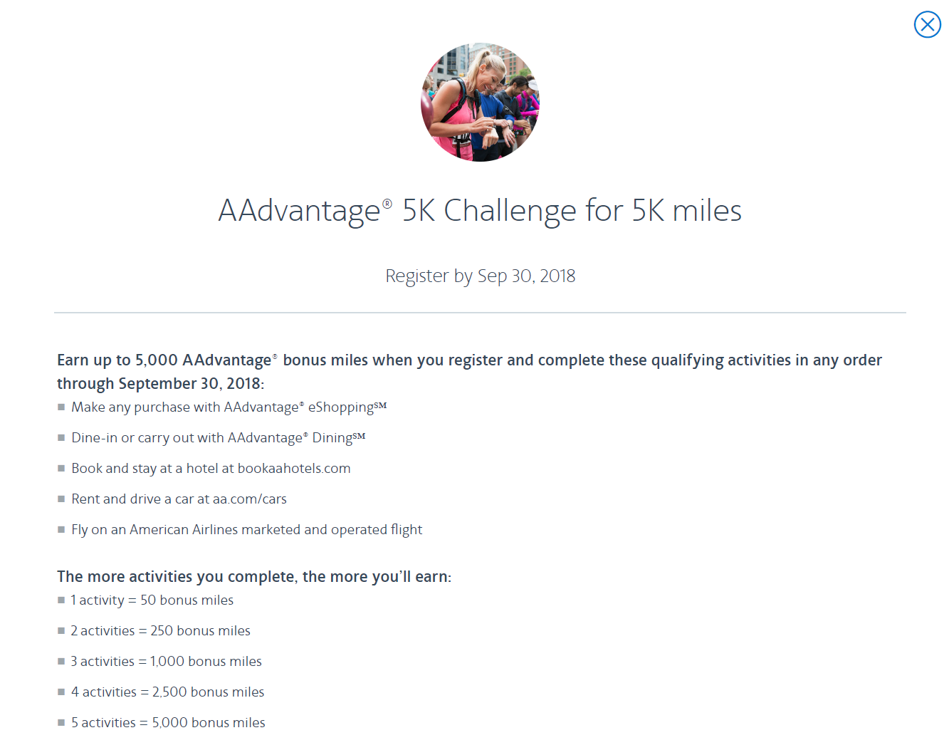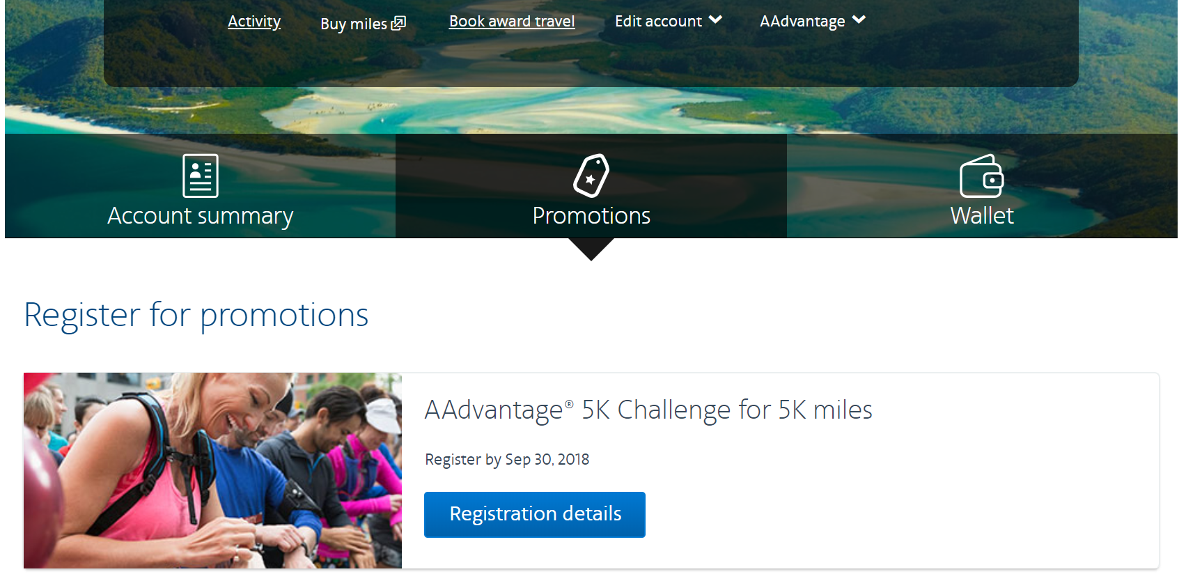 The first step to take AAdvantage of this promotion is to register. To do so, log into your AAdvantage account and then browse to the Promotions tab. Open the "AAdvantage 5K Challenge for 5K Miles" promotion and scroll to the bottom to register.