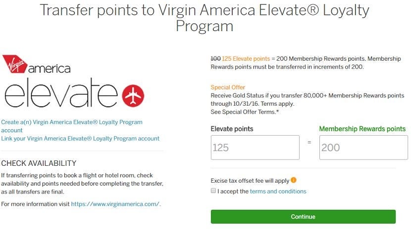 In what might be a new annual tradition, Virgin America is partnering with American Express to offer Virgin American Gold status for transferring Membership Reward points. Now through October 31, 2016, transfer 80,000 Membership Reward points to Virgin America's Elevate program for Virgin America Gold status and 50,000 Elevate points.