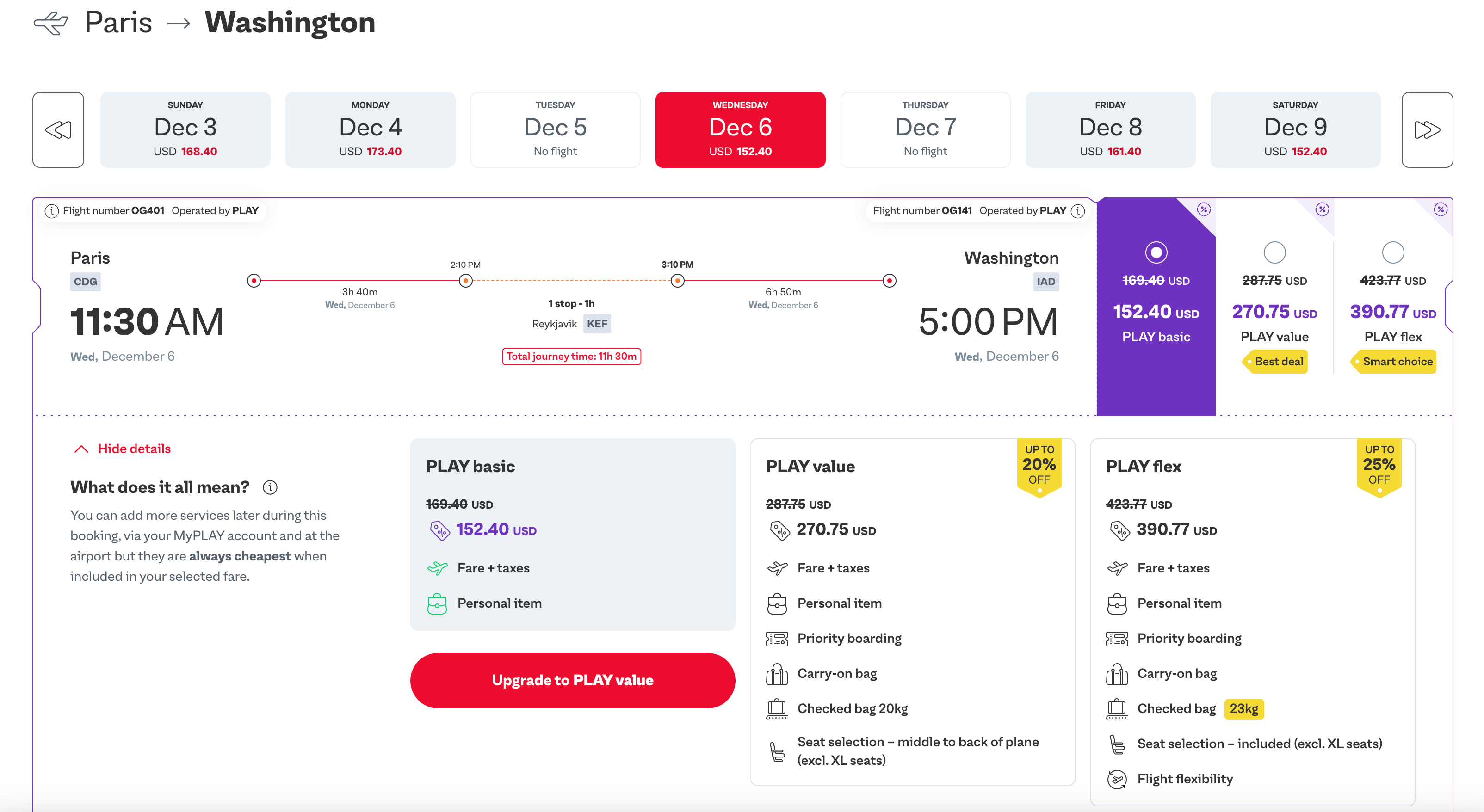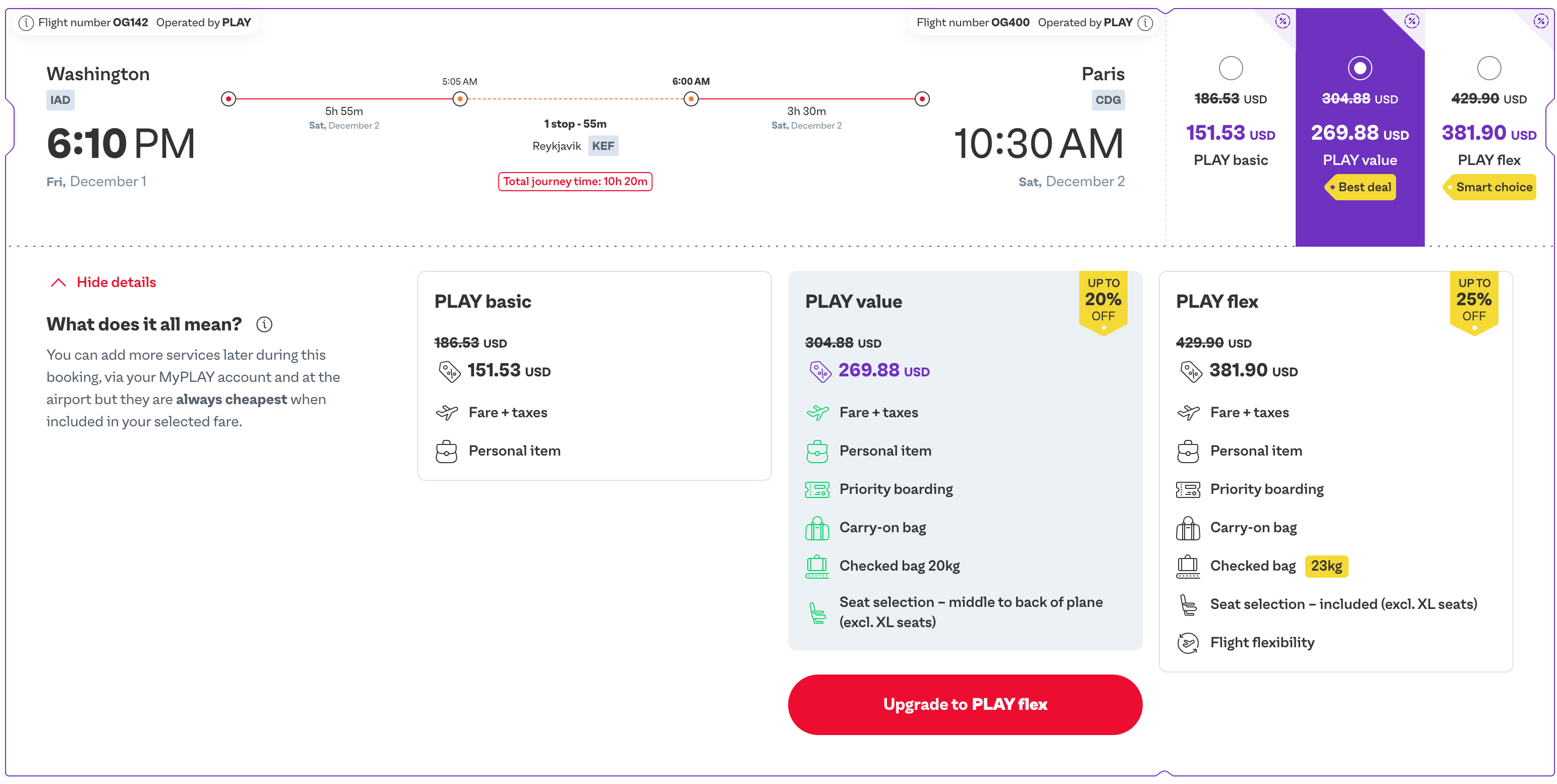 The Play Basic fare on the return flight isn't discounted by as much but still costs about $152. This brings the round-trip total to just about $304.