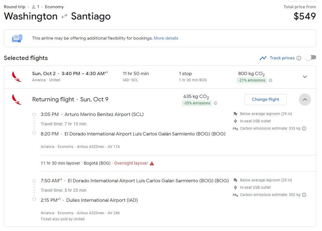 Travelers can go from Washington, D.C., (IAD) to Santiago (SCL) for $549 round-trip, cheaper by over $400 for the dates below at the beginning of October, according to Google Flights. Be warned though: There is an overnight stop over 11 hours long in Bogota (BOG) on the return flight.