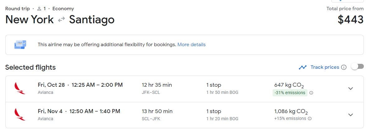 Flights from New York (JFK) to Santiago (SCL) cost as little as $443 round trip and have short layovers of under two hours in Bogota (BOG) each way. According to Google Flights, this deal is over $450 less than usual.