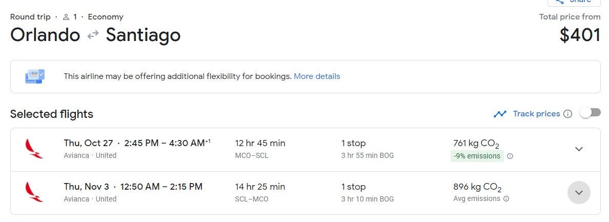 One of the cheapest deals we found is from Orlando (MCO) to Santiago (SCL) for $401 round trip. This flight is over $500 cheaper than usual for the dates below from the end of October to the beginning of November, according to Google Flights.