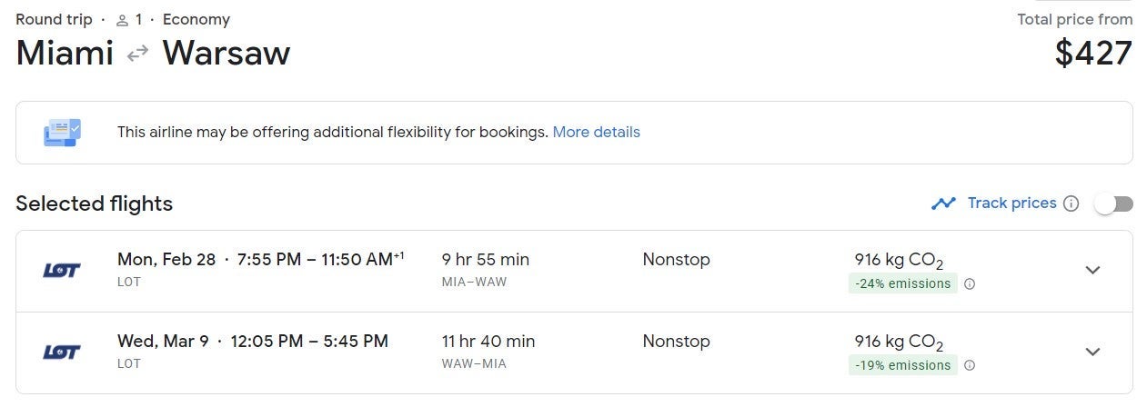 One of the least expensive deals was a nonstop flight from Miami (MIA) to Warsaw (WAW) at $427 round-trip.
