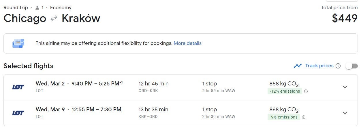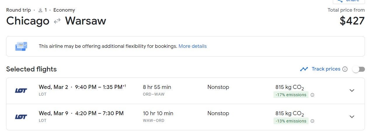 Nonstop flights from Chicago (ORD) to Warsaw (WAW) were also $427 round-trip throughout February and March.