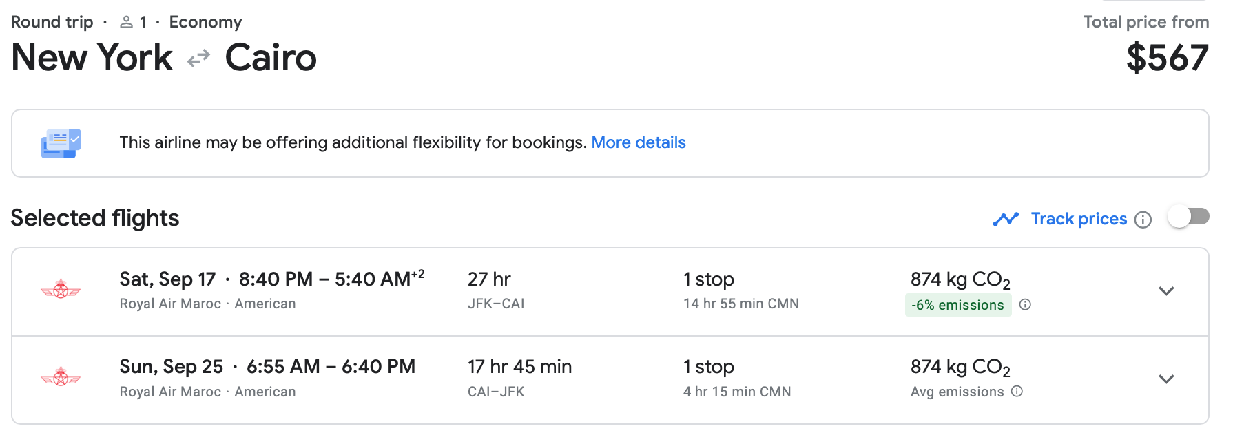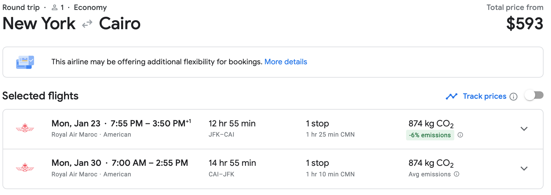 The same NYC-Cairo route in January on Royal Air Maroc is a bit more expensive but has a much more reasonable layover.