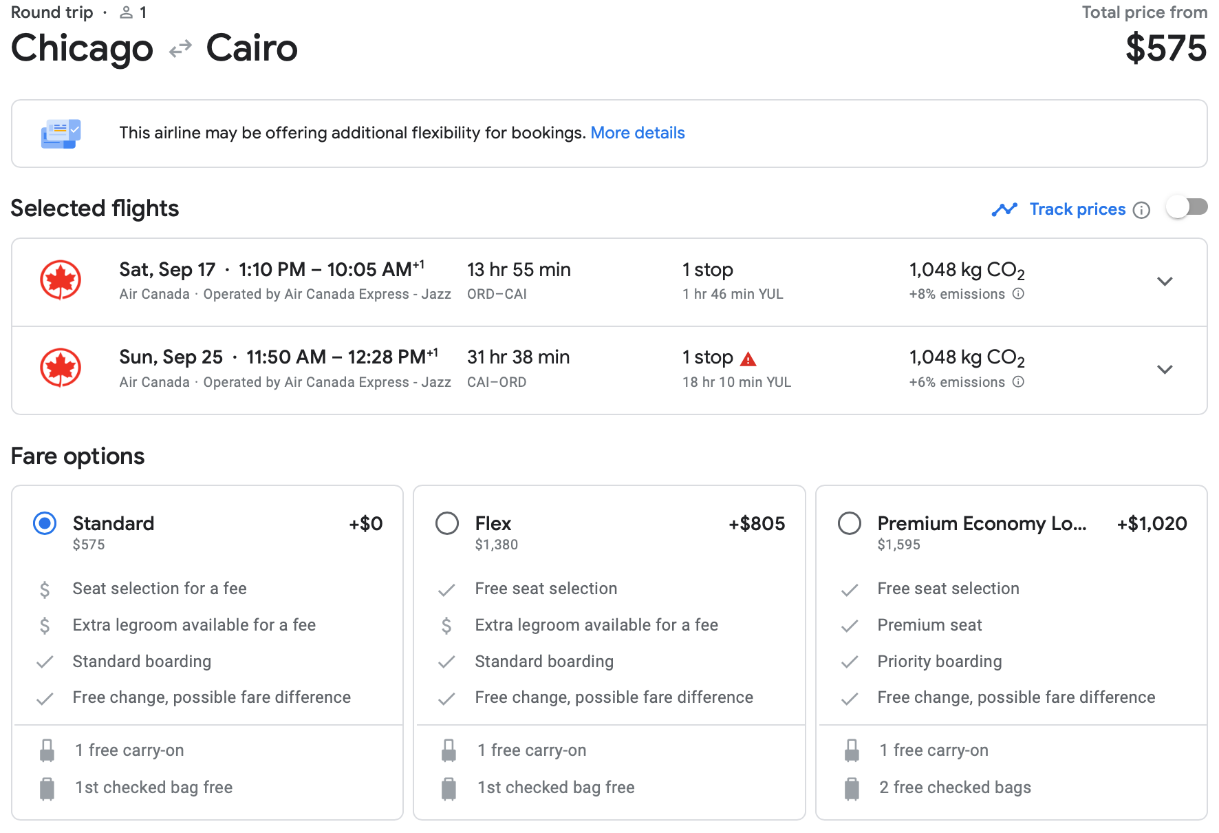 We found a few truly spectacular deals out of Chicago. This itinerary from O'Hare International Airport (ORD) to Cairo in late September on Air Canada is only $575 round-trip. That's more than $600 less than what you would normally expect to pay for this route. It does have an 18-hour layover in Montreal on the return flight, but that's a great city to find yourself with a day to enjoy. Also, Air Canada's Standard fare comes with a free carry-on and your first checked bag is free.