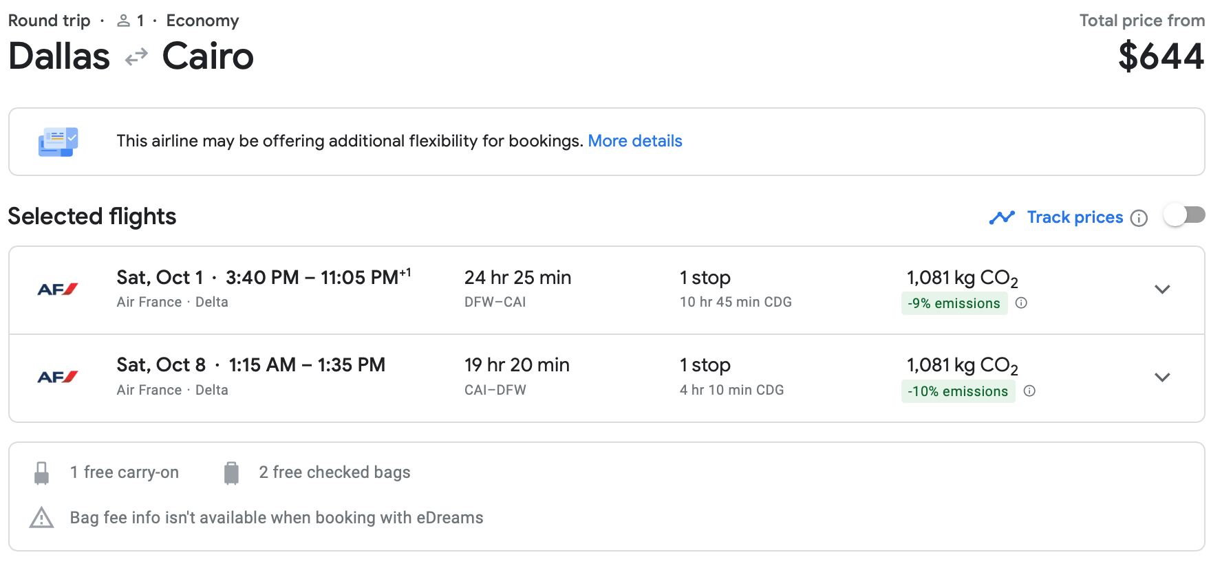 You can book a ticket through Delta to fly from Dallas (DFW) to Cairo for $644 round-trip, a really nice discount from normal prices. This fare comes with a free carry-on and two free checked bags.