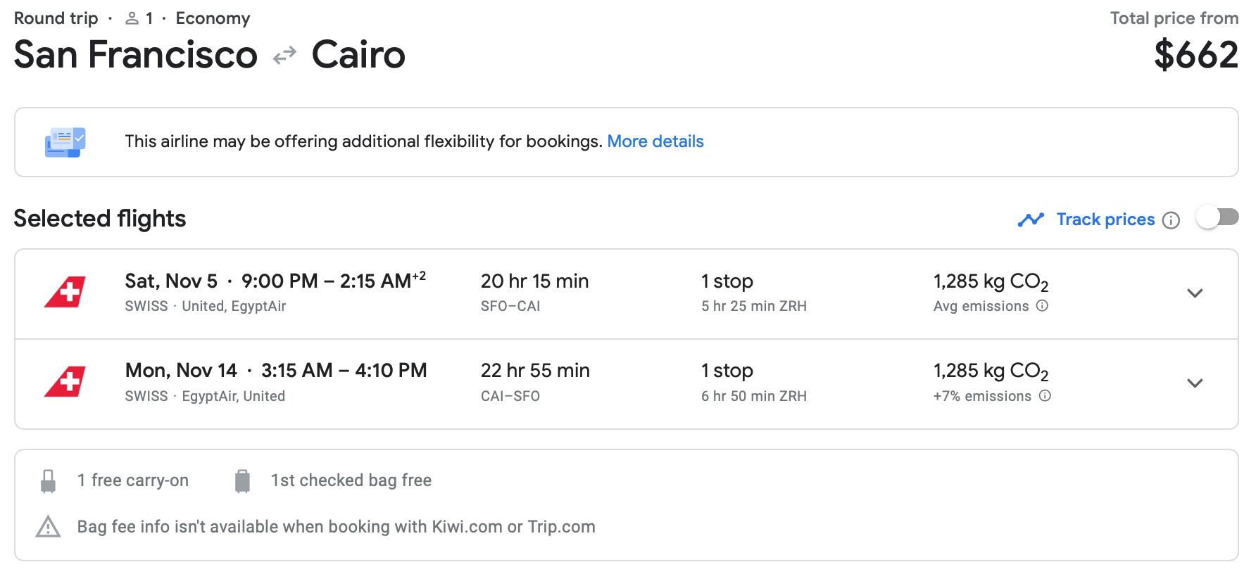 If you prefer to visit the Pyramids in December, we found this epic deal from Swiss Air Lines from O'Hare to Cairo for only $608 round-trip. The layovers in Zurich aren't quite as bad on this route, and the savings are incredible. And like the Air Canada ticket we mentioned earlier, this Swiss itinerary comes with a free carry-on and your first checked bag for free.
