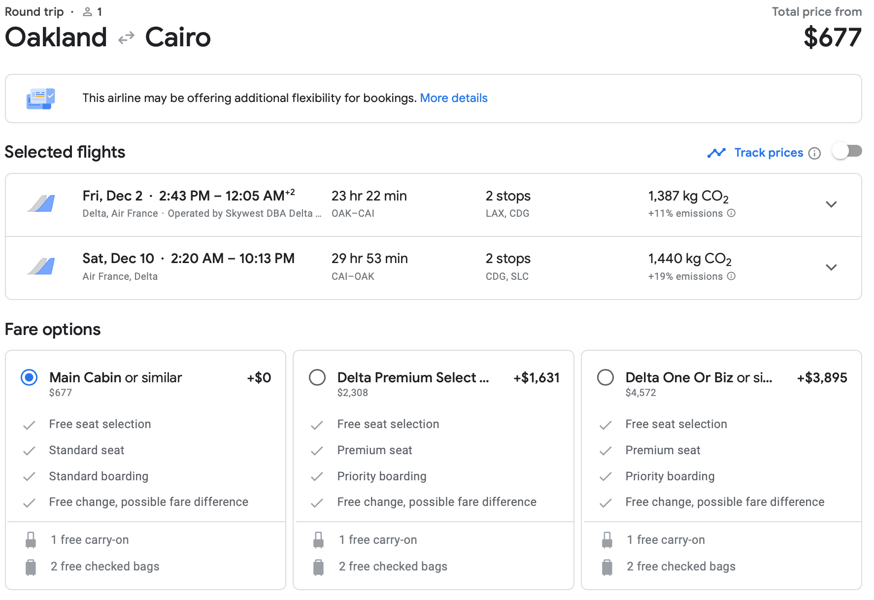 We didn't forget about Oakland. You can save a lot of money on flights from Oakland International Airport (OAK) to Cairo. We found some fares in December and January that are more than 50% off normal prices. The caveat is that the discounted flights all had two stops. Here's one example on Delta we liked, that comes with a free carry-on and two free checked bags.