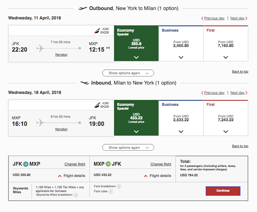 New York (JFK) to Milan (MXP) for $784 for two passengers in April in economy: