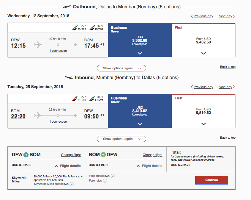 Dallas (DFW) to Mumbai (BOM) for $6,783 for two passengers in September in business class: