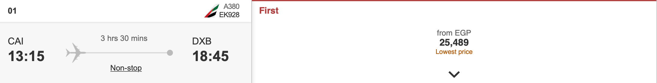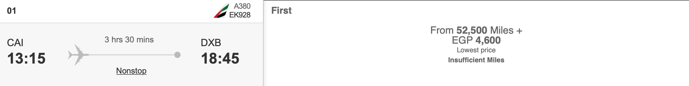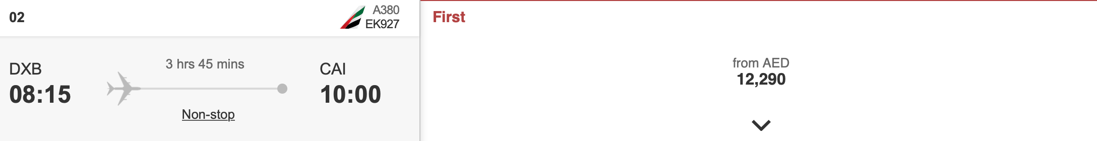 This is some pretty exciting news for those of us who have been eyeing Emirates' first class but haven't yet been able to afford it. Though it's not cheap, first class cash fares ring in at $1500 from Cairo (CAI) to Dubai (DXB), and $3300 the other way around (DXB-CAI).