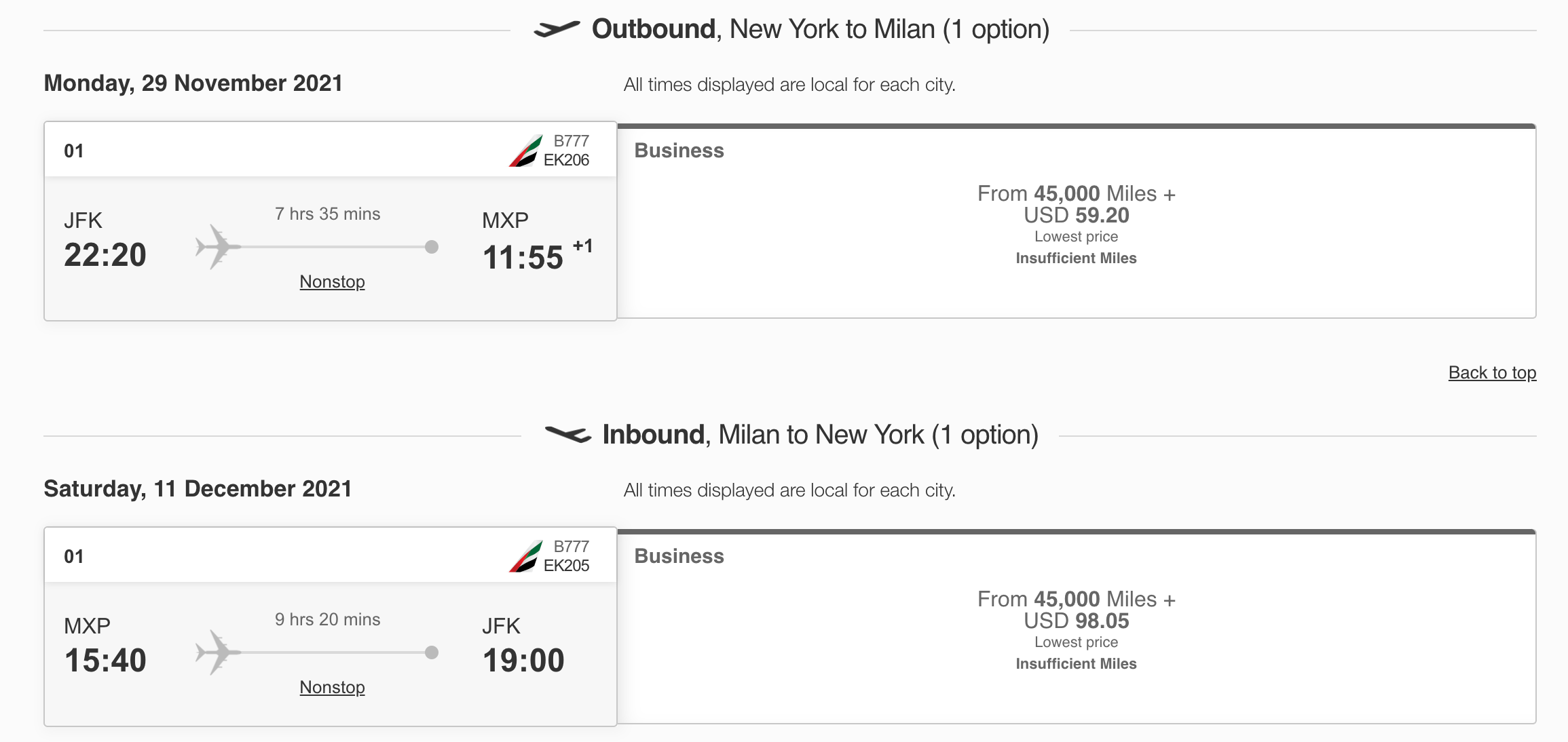 New York (JFK) to Milan (MXP) for 90,000 Skywards miles and $158 in taxes and fees