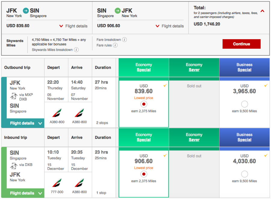 New York (JFK)-Singapore (SIN) for $873 per person on Emirates (earns 4,750 miles + 4,750 tier miles):