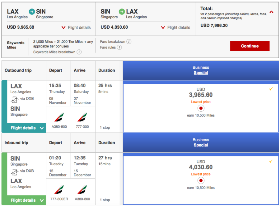 Los Angeles (LAX)-Singapore (SIN) for $3,998 per person in business class (earns 21,000 miles + 21,000 tier miles):