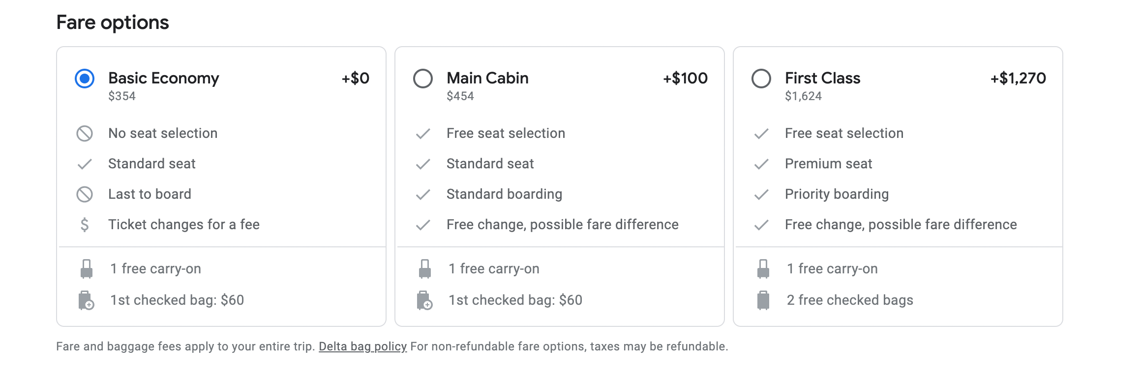 Delta's basic economy fare type does not let you select a seat or make any changes to your flight. If you're a Delta SkyMiles member, the economy basic option does not let you earn credit toward SkyMiles Medallion Status.