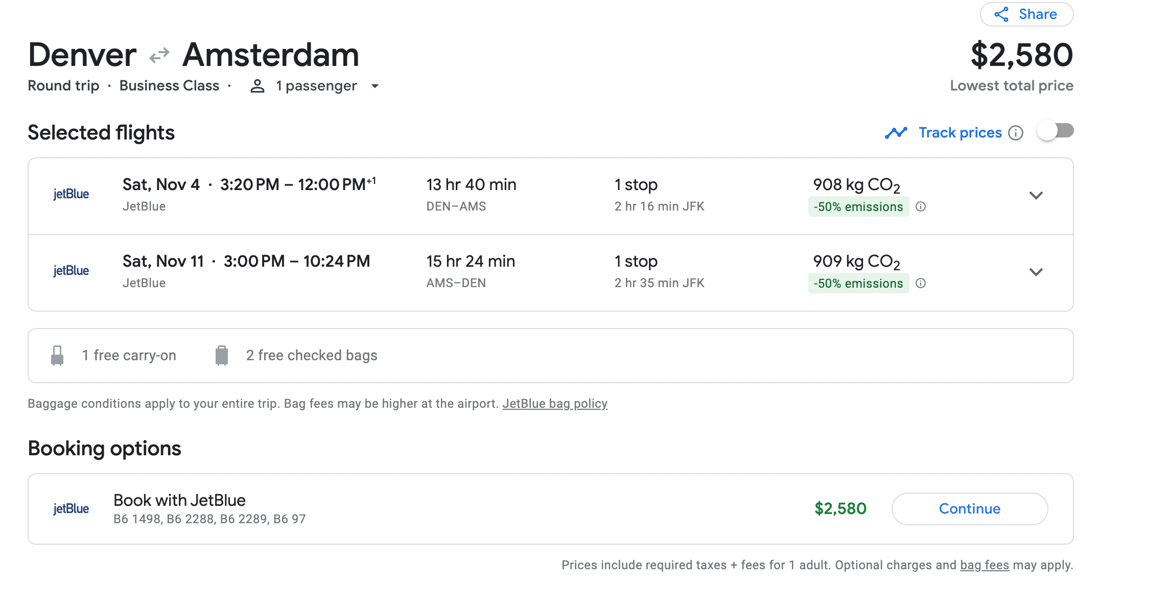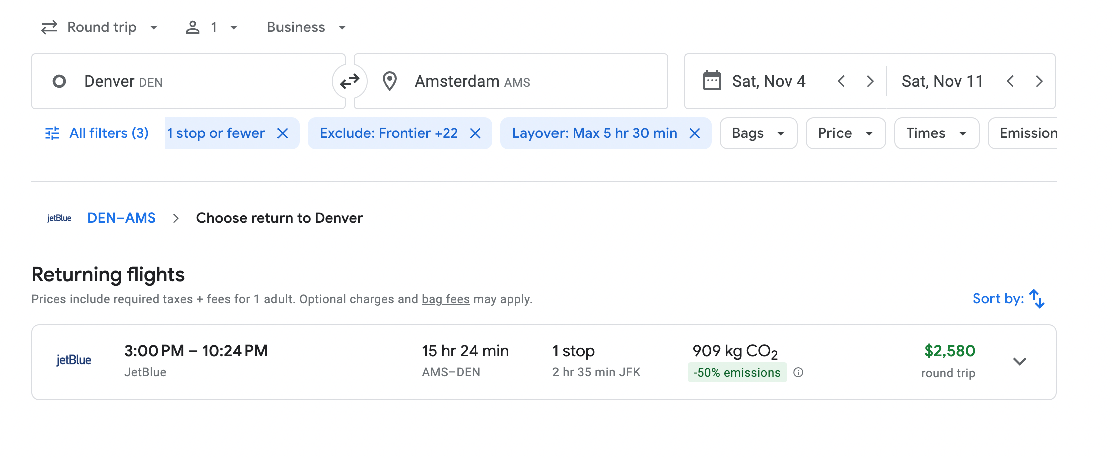 - JetBlue: Denver International Airport (DEN) to Amsterdam Airport Schiphol (AMS), starting at $2,580 (includes a layover in New York City).
