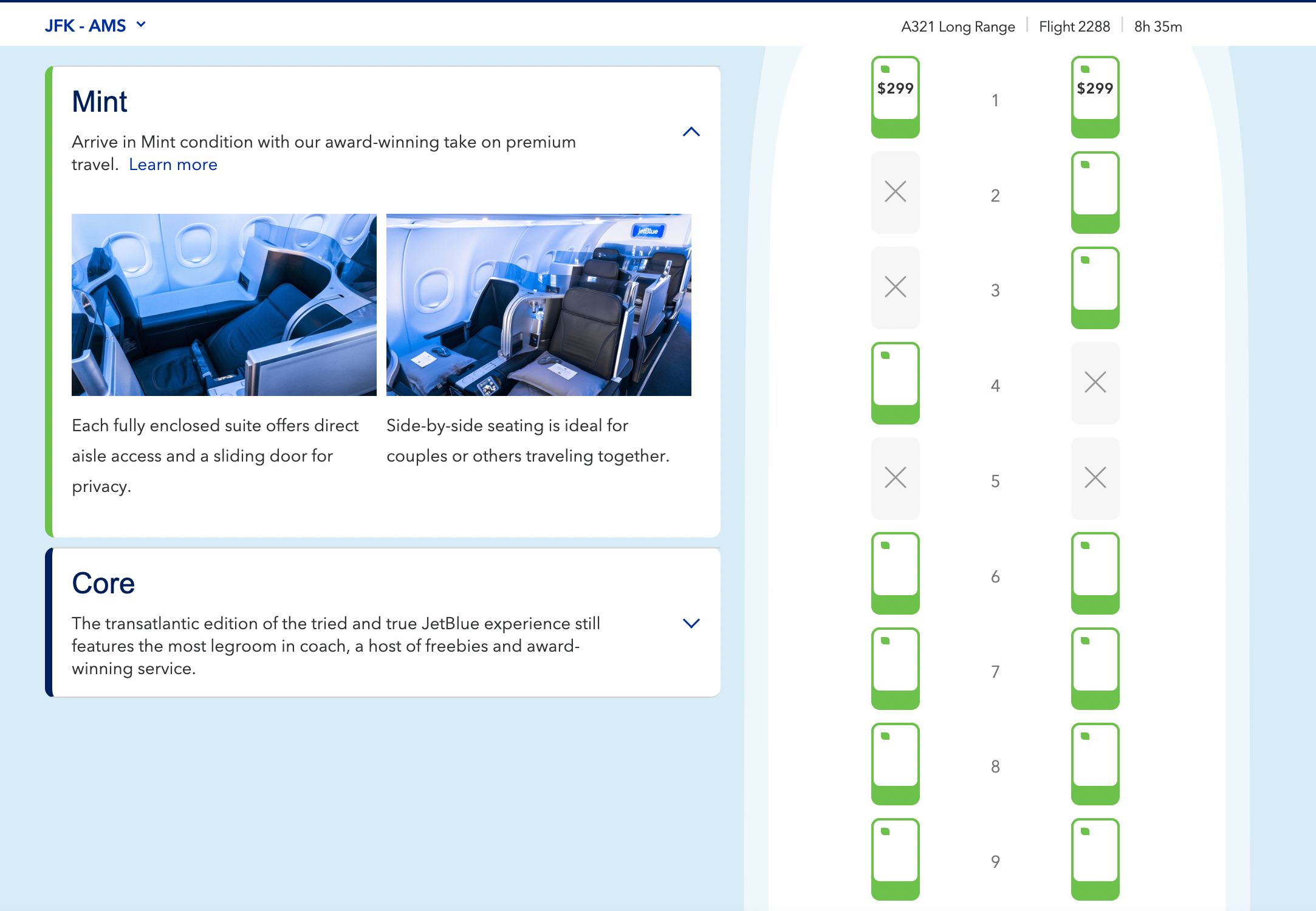 These flights are in JetBlue's Mint class, so you'll also receive a variety of perks. JetBlue's Mint class allows passengers to bring a free carry-on and two checked bags. Also, the Mint seats are more spacious compared to economy-class seats.