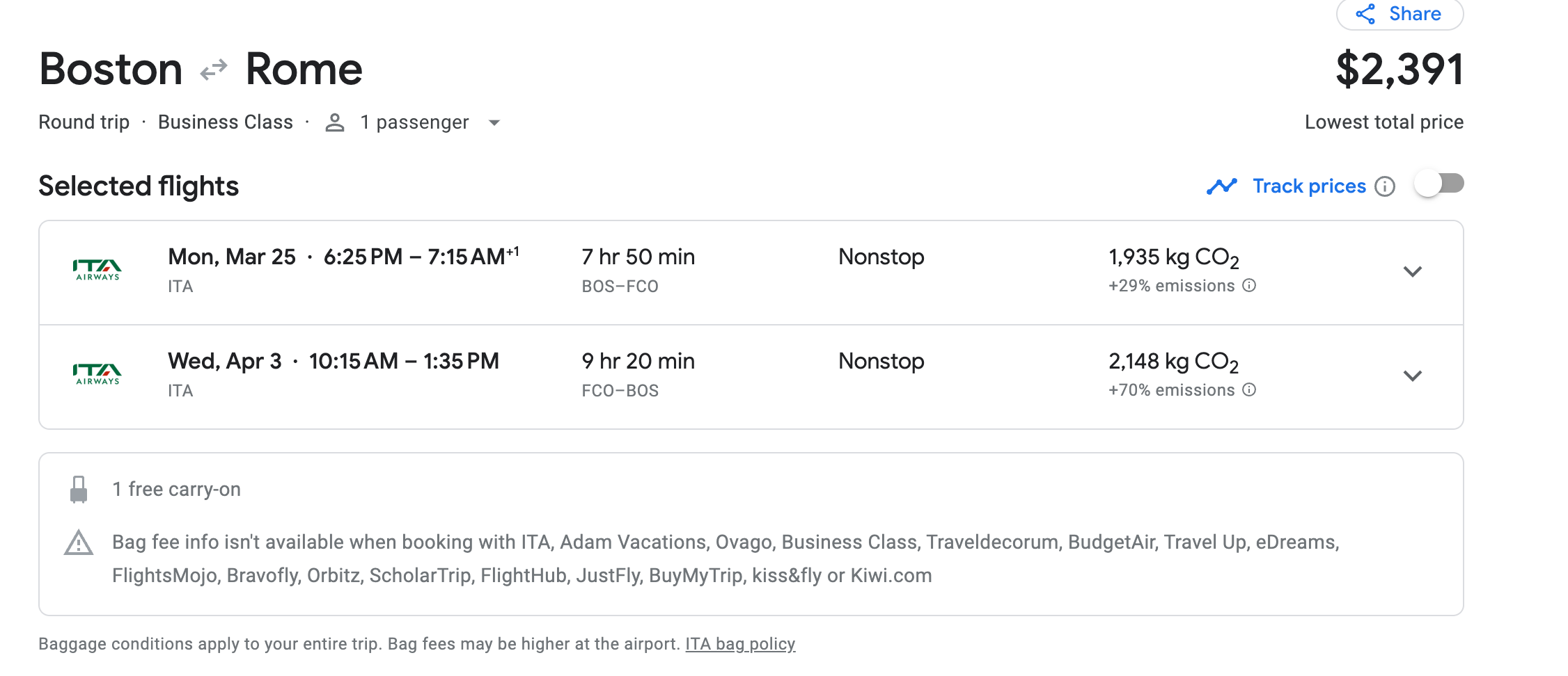 A nonstop business-class flight from Boston to Rome would usually cost upward of $4,000. However, thanks to this deal, fare options are as low as $2,391 on Italian airline ITA Airways.