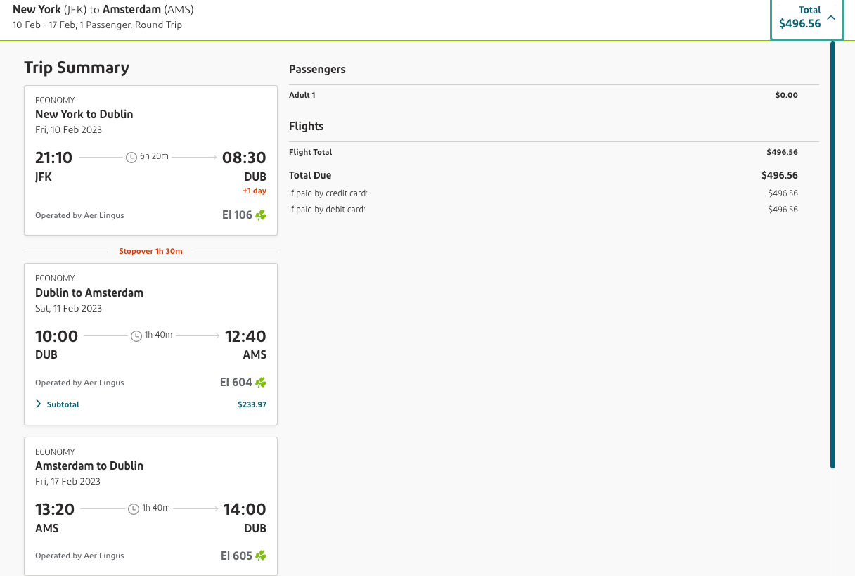The lowest-priced flights available will be for the carrier's most restrictive economy fare, which in this example is Aer Lingus' saver fare. These fares include one carry-on bag but charge between $25-$65 for checked baggage depending on the size.