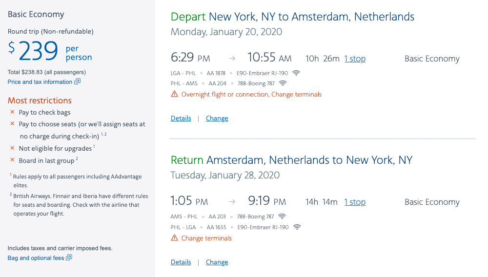 New York (LGA) to Amsterdam (AMS) for $239 round-trip on American: