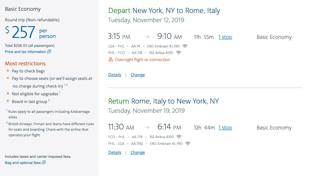 New York (LGA) to Rome (FCO) for $257 round-trip on American: