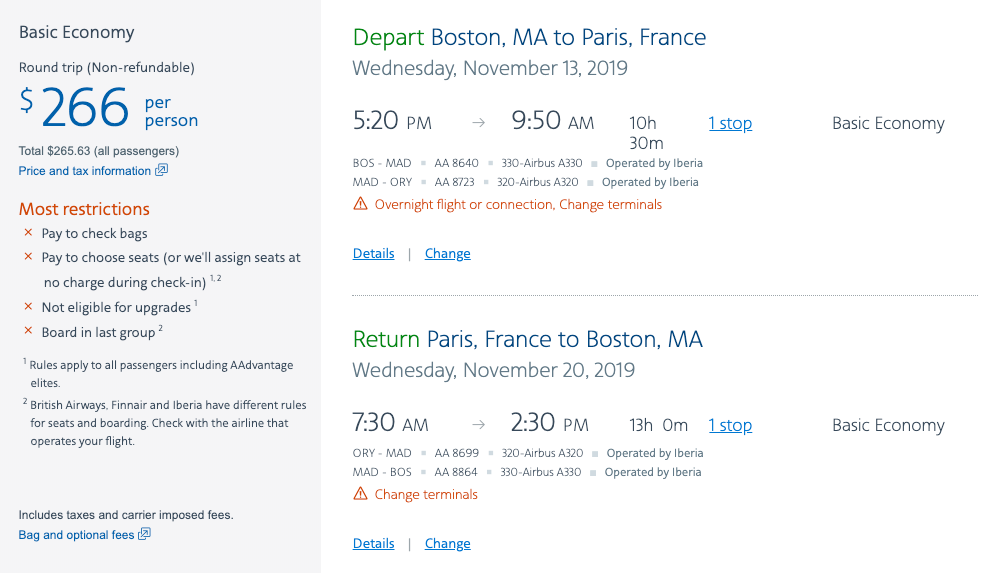 Boston (BOS) to Paris (ORY) for $266 round-trip on American: