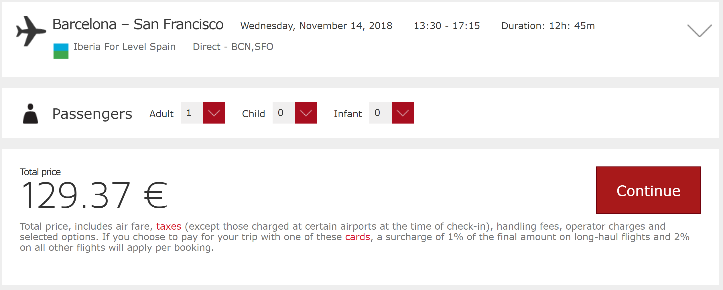 San Francisco (SFO) to Barcelona (BCN) in November for $311 round-trip on LEVEL ($159 outbound + $152 return):