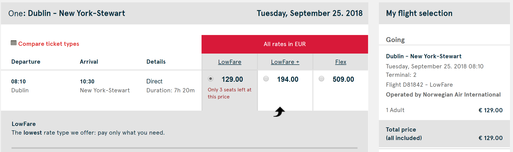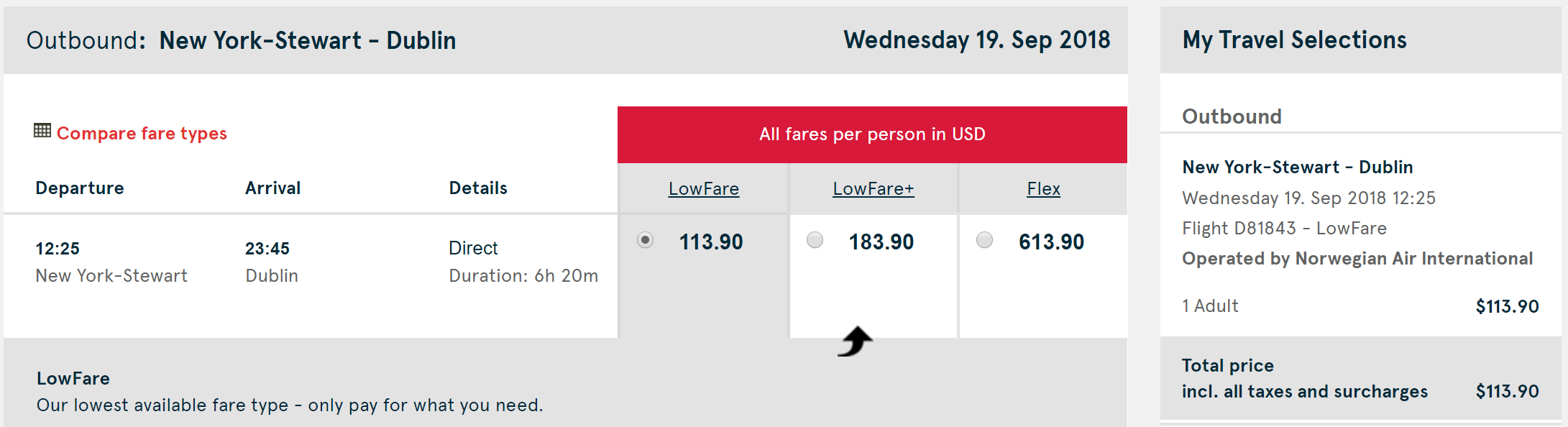 New York Stewart (SWF) to Dublin (DUB) in September for $265 round-trip on Norwegian ($114 outbound + $151 return):
