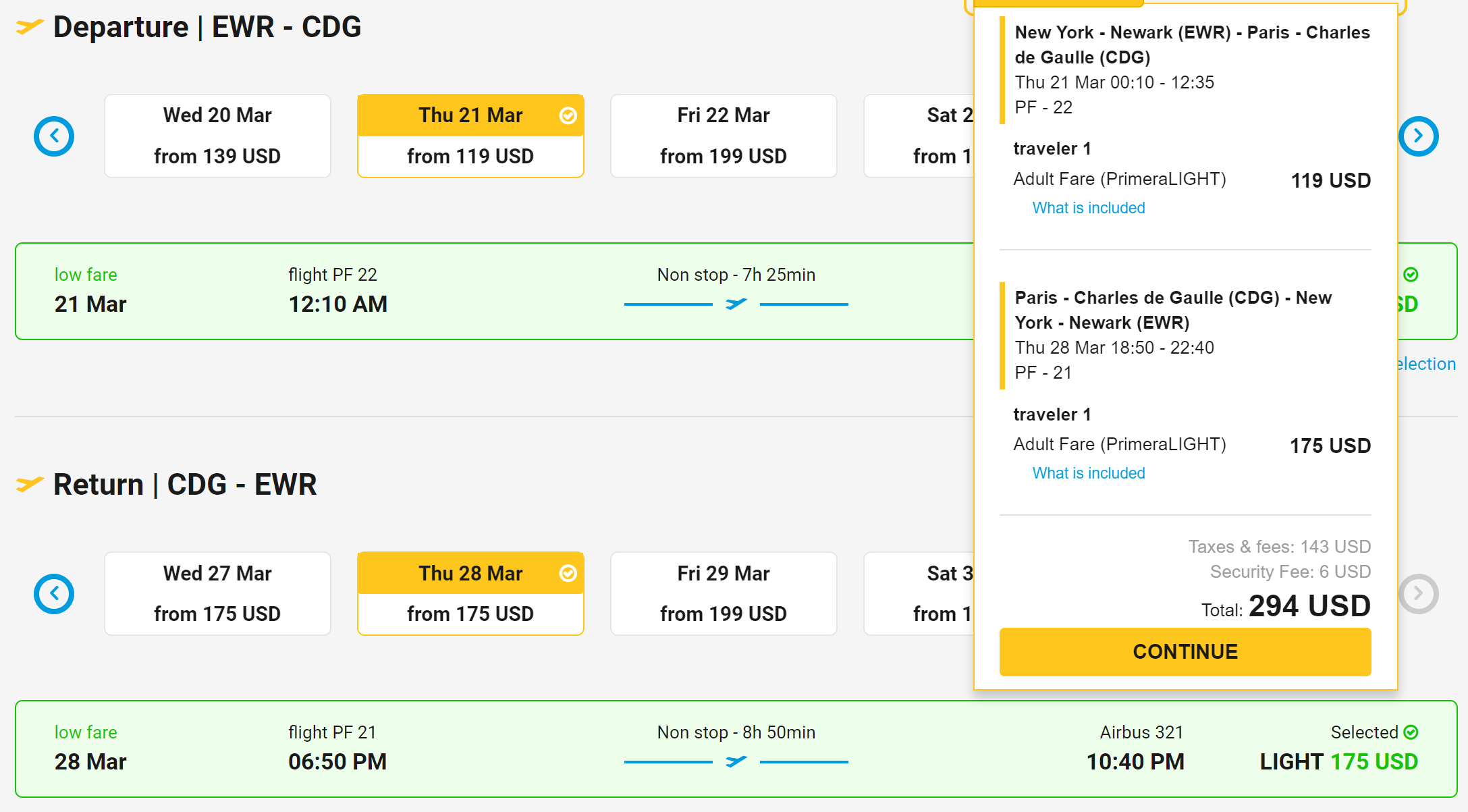 Newark (EWR) to Paris (CDG) in March for $294 round-trip on Primera Air: