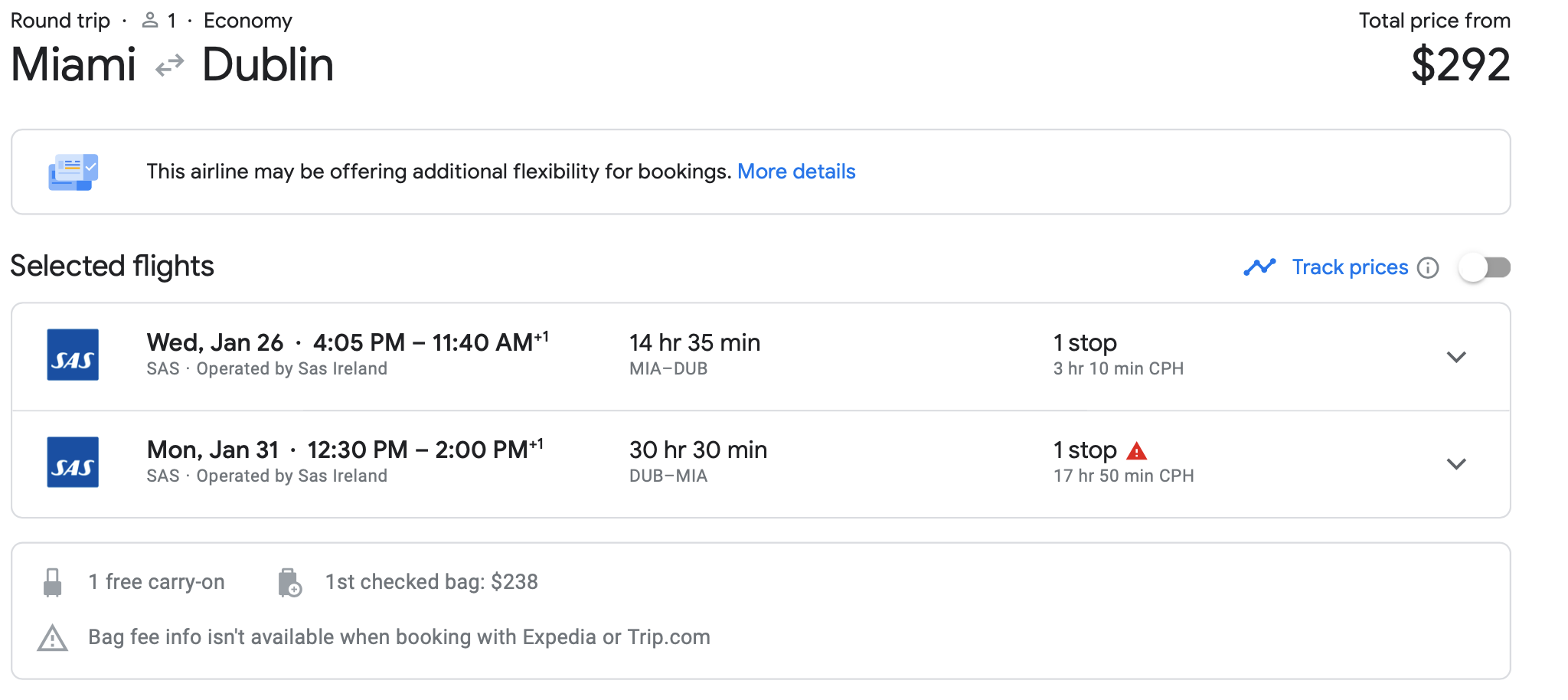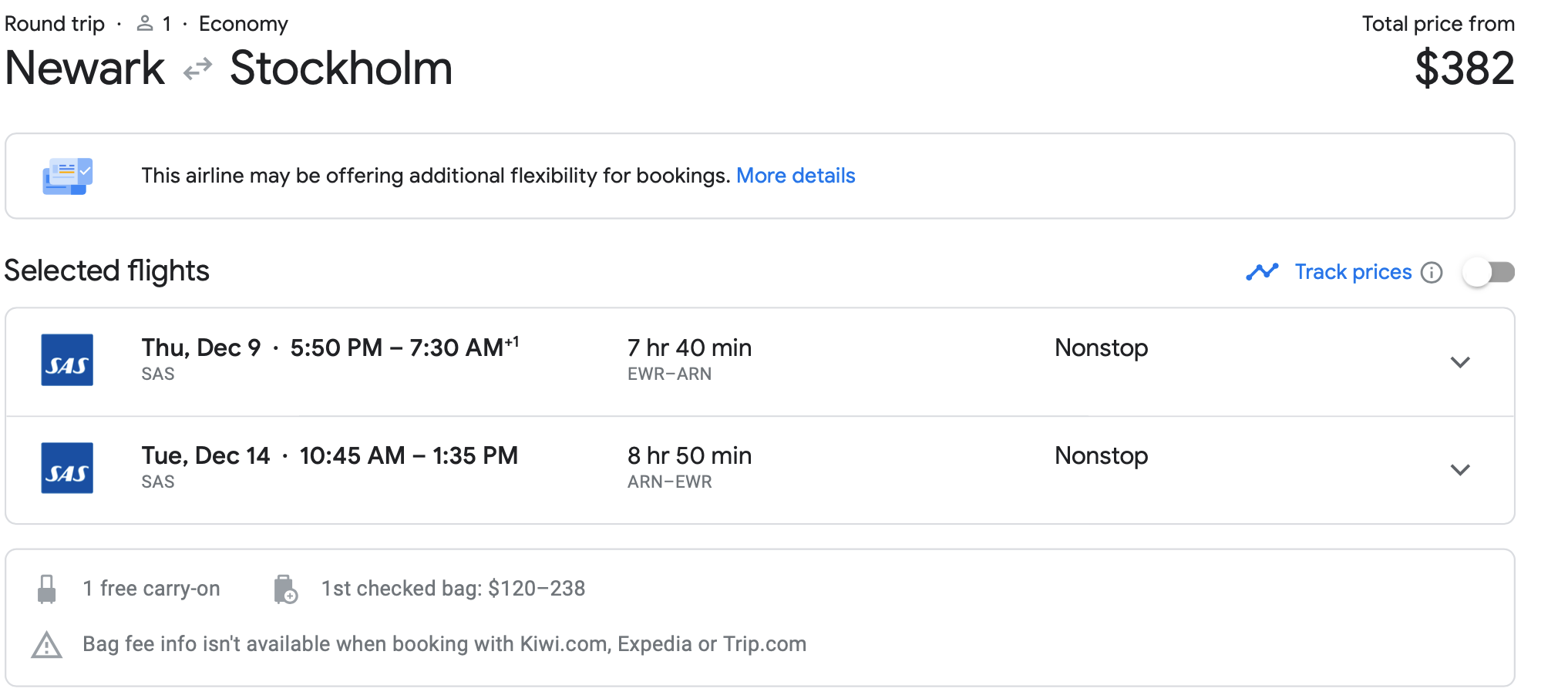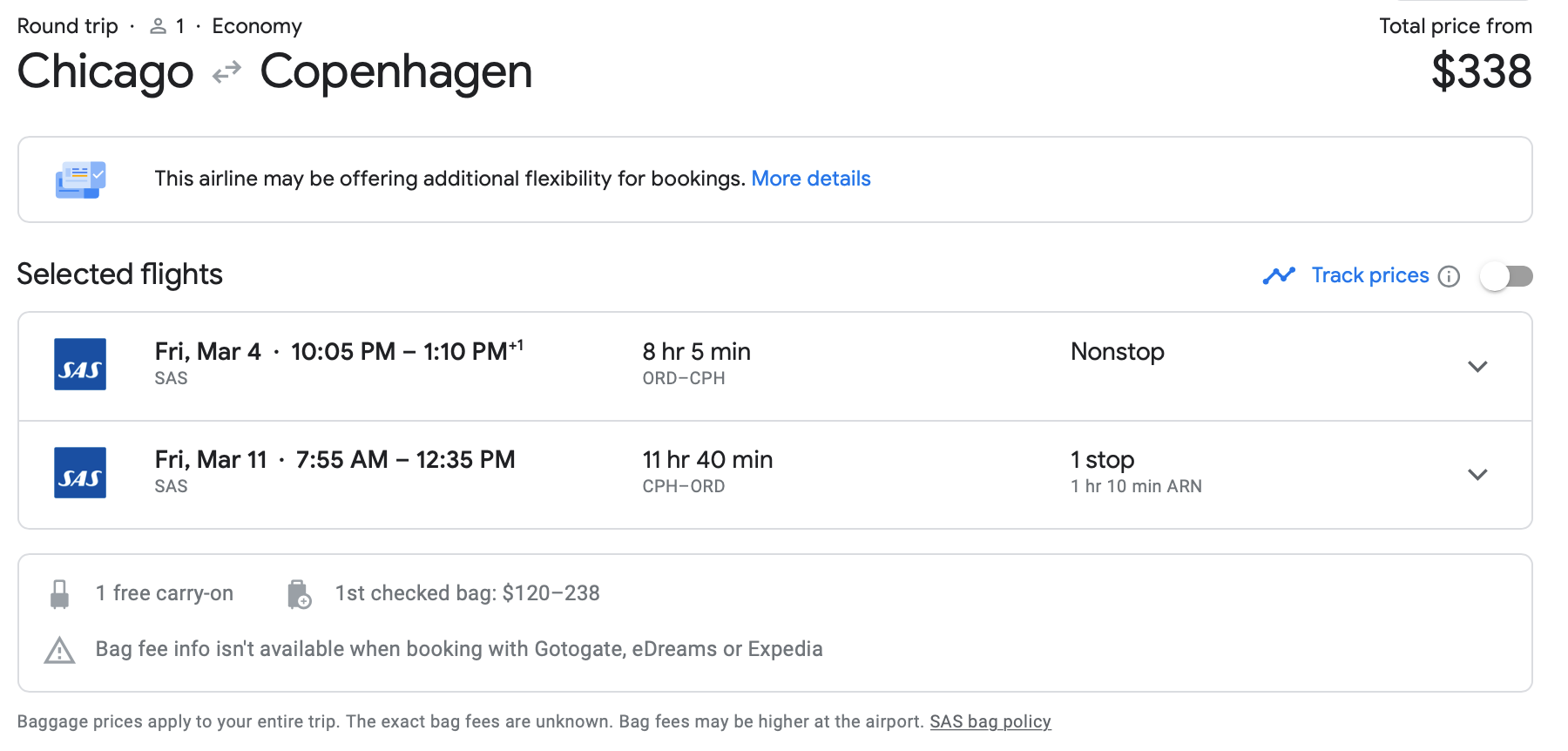 Again, that price comes with some long layovers, including a 27-hour stop in Copenhagen. You can find other flights with shorter layovers, but that will cost you around $420 per ticket during the sales period. But if you don't mind taking a quick day trip through Copenhagen, then this itinerary may be just right for you.